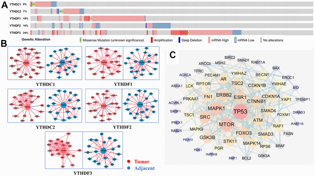 Next, Using HCCDB database to evaluate the associated molecules of YTH domain family, we found that the interactive molecules of all members had altered significantly between tumor tissues and adjacent normal tissues, respectively (Figure 4B). Additionally, we used cBioPortal to extract 203 most frequently altered genes that were significantly linked to the YTH domain family in HCC patients (Supplementary Table 2). The data indicated that several hub genes, such as tumor protein p53 (TP53), mammalian target of rapamycin (MTOR) and mitogen-activated protein kinase 1 (MAPK1), were closely linked to the biological processes in YTH domain family in HCC patients (Figure 4C). Above data suggested that YTH domain family participated in the regulation of various signaling pathways involved in HCC biology.