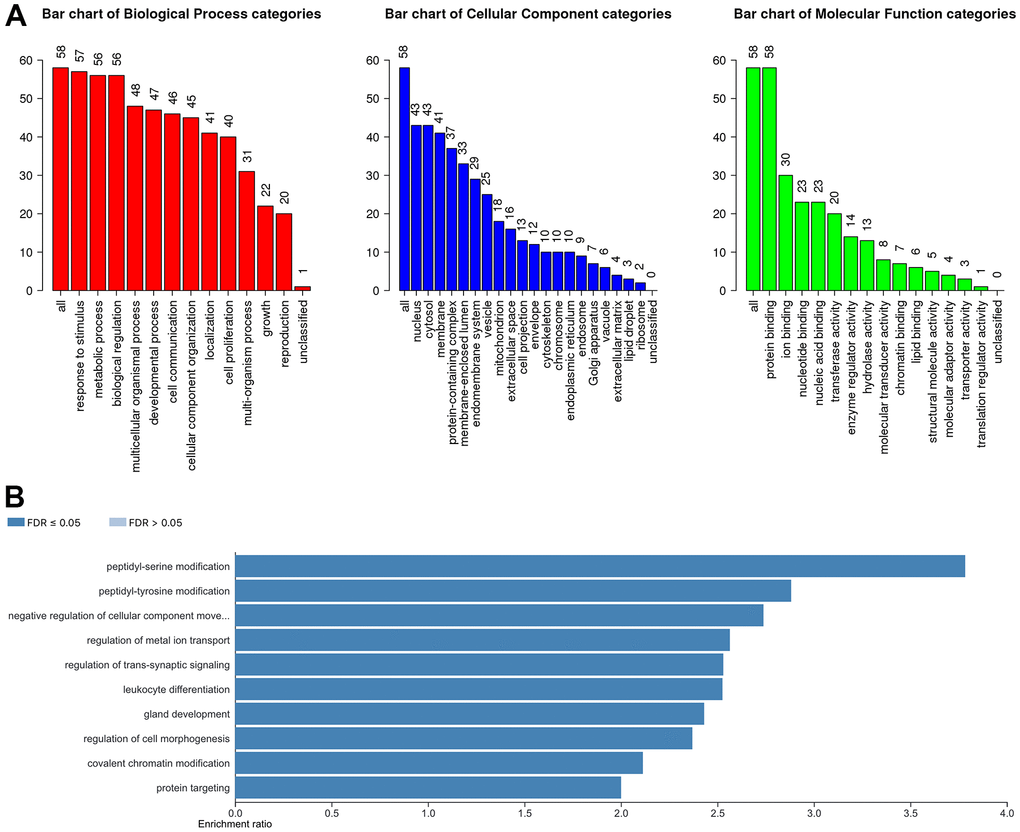 In our study, we applied the WebGestalt database to evaluate the potential biological functions of YTH domain family in the occurrence and development of HCC. As shown in the Gene Ontology (GO) term analysis (Figure 5A), we know that the most highly enriched biological process (BP) category was response to stimulus, followed by metabolic process, biological regulation, etc. In the cellular component (CC) categories, membrane, nucleus, cytosol, membrane-enclosed lumen, protein-containing complex, endomembrane system and vesicle were highly accumulated. In the molecular function (MF) categories, the YTH domain family members were mainly enriched in protein binding, nucleotide binding, nucleic acid binding, ion binding and transferase activity. Meanwhile, the Kyoto Encyclopedia of Genes and Genomes (KEGG) pathway analysis results are shown in Figure 5B. We can conclude that several cancer-associated pathways, including peptidyl-tyrosine modification, peptidyl-serine modification and negative regulation of cellular component movement, were strongly linked to the potential biological functions of YTH domain family in the occurrence and development of HCC.