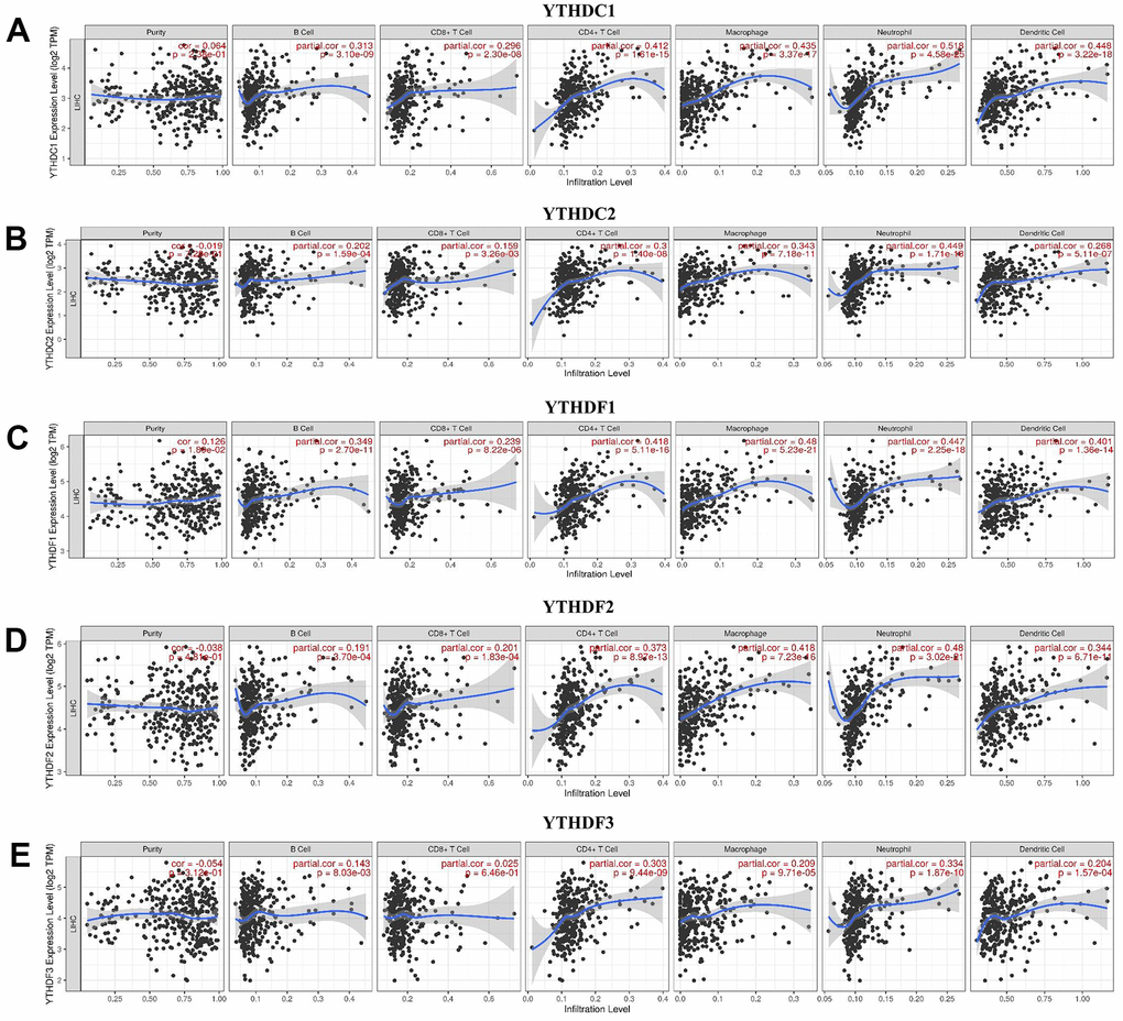 TIMER is used to evaluate the connection between infiltrating immune cells and cancer cells, which could provide more rational strategies for an improved therapeutic response and prognosis [41]. We mainly performed correlation analysis between the expression of YTH domain family with immune cells using the TIMER database.