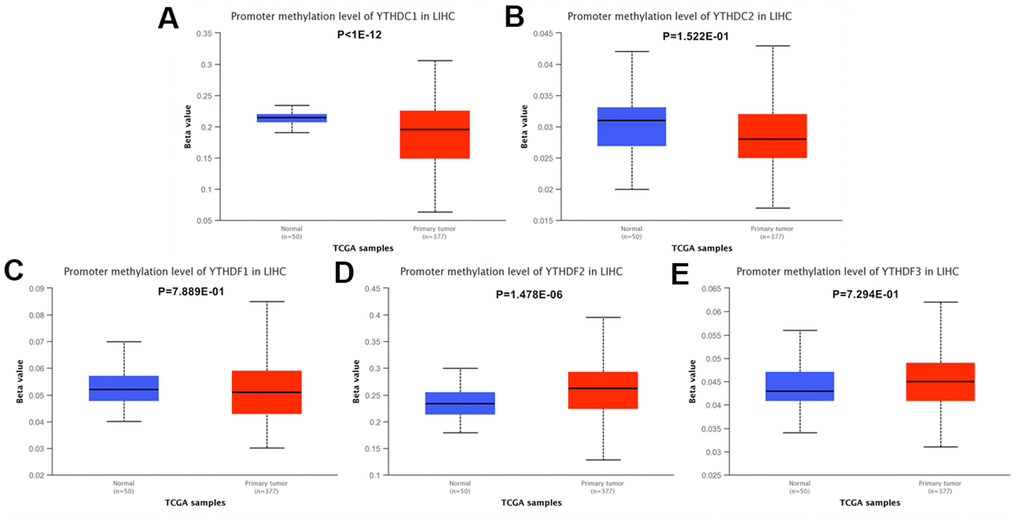 Furthermore, we analyzed the methylation levels of YTH domain family by searching Ualcan database. We found that the methylation levels of YTHDC1 (p < 1E-12) was higher in HCC patients than in normal cases; while YTHDF2 (p = 1.478E-06) was lower in HCC patients (Figure 7). These downregulated methylation values might explain their difference in expression levels to some extent.