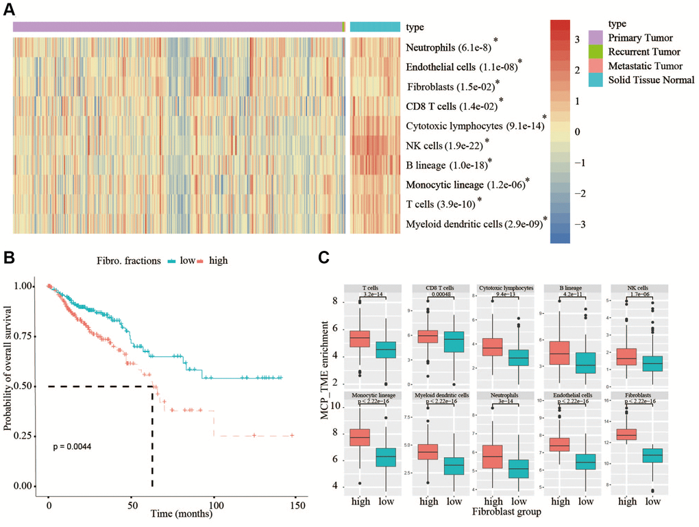 The quantification of tumor stroma is critical to unveil the multi-faceted role of the TME, which may be involved in affecting overall survival (OS) of CRC patients. From TCGA bulk transcriptomic data, we compared the quantification of cellular components of immune cells and mesenchymal cells between 375 cancerous tissues and 55 adjacent normal tissues using the MCP-counter, a tool to estimate cellular content by scoring marker gene expression, the result showed that the content of all types of immune cells and mesenchymal cells in normal tissues are higher than that in cancerous tissues (Figure 1A). Therefore, the TME must play a key role in the occurrence and development of tumors. In view of the crucial roles of the fibroblasts in tumor progression, then we divided the 375 patients into a high-fibroblast group and a low-fibroblast group according to the median of the fibroblast content. From analyzing the relationship between OS and the content of fibroblasts in CRC patients, we observed OS was significantly longer in the low-fibroblast group than in the high-fibroblast group (Figure 1B). Because the TME has an important impact on patients with colorectal cancer, we further investigated the abundance of tumor infiltrating lymphocytes between low- and high-fibroblast groups. We found the abundance of immune cells in the high-fibroblast group was significantly higher than that in low-fibroblast group (Figure 1C).