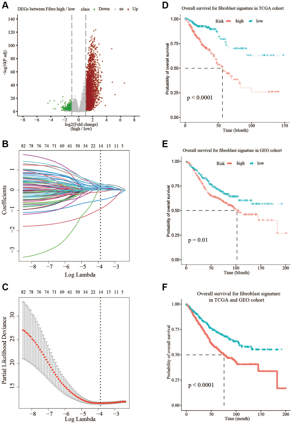 The OS was defined as the time from diagnosis to death or the last follow-up date. Univariate Cox was used to obtain 222 prognostic genes in training set through traversing all DEGs in fibroblast high/low condition, and LASSO-penalized Cox regression was used to construct optimal prognostic risk signatures in training group. The COX regression model with the LASSO penalty successfully achieved compression and selected 14 fibroblast-related genes simultaneously. The risk score formula was as follows: