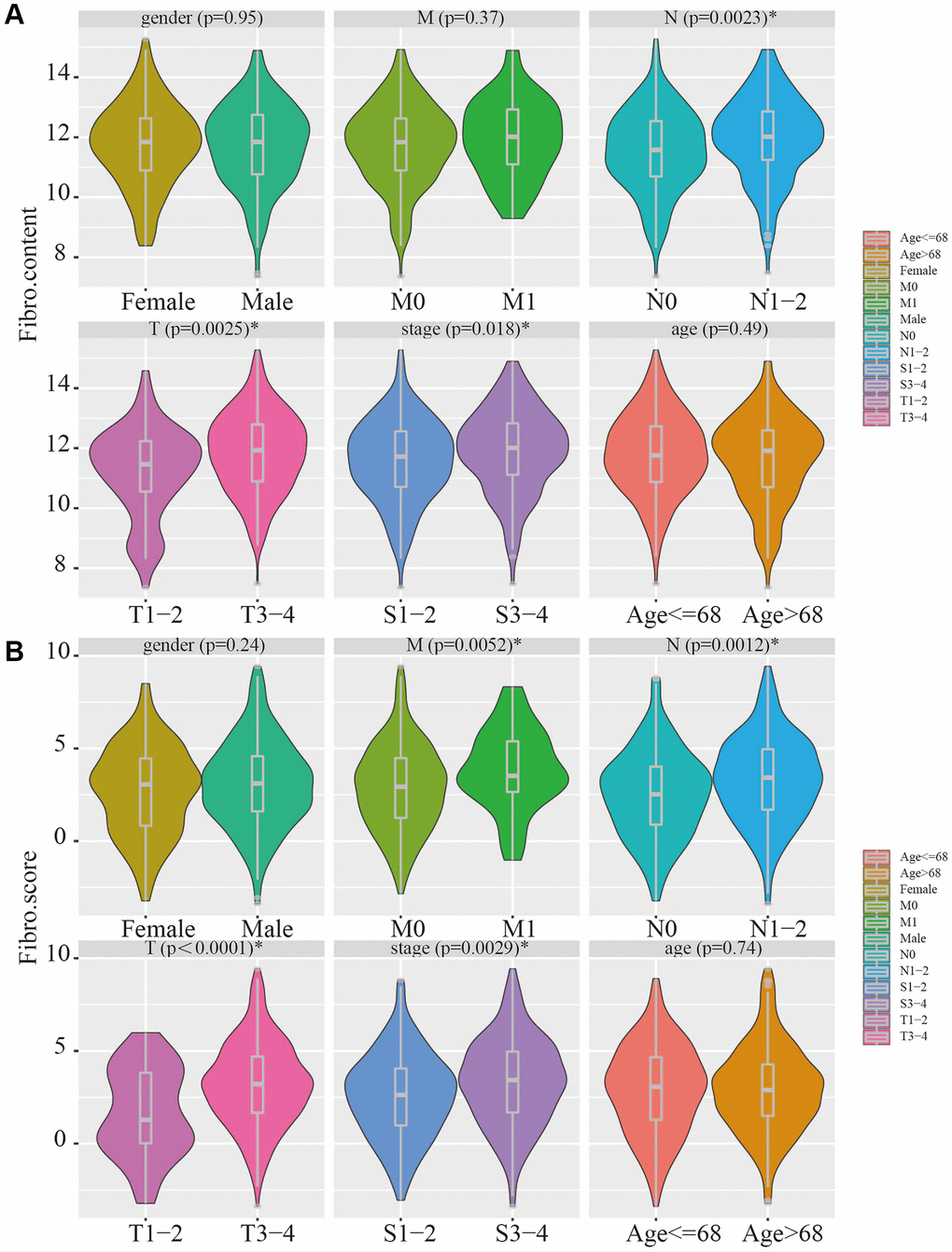 The relevance of the fibroblast content relative to clinical traits including age, gender, stage, and TNM status was assessed using the TCGA database. The fibroblast content was significantly increased in the advanced stage, advanced T stage, and positive lymph node metastasis groups (Figure 5A). Assessment of the relationship between risk score and clinical traits in TCGA showed that the score was significantly higher in the advanced stage, advanced T stage, positive lymph node metastasis, and distant metastasis groups (Figure 5B).