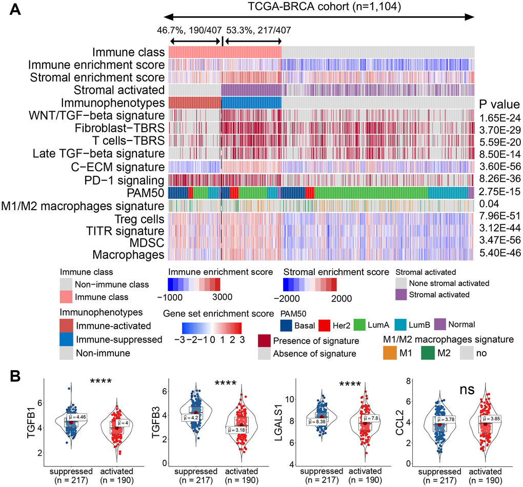 The role of the TME component in regulating immune activation varies with the release of chemokines, cytokines, and other soluble factors, as well as ligands expressing inhibitory receptors [19, 20]. To explore the component influencing the immunotherapeutic effect, the immune class was further analyzed using the nearest template prediction (NTP) algorithm. As shown in Figure 2A, 46.7% (190/407) of patients showed a lack of stromal-activated signatures and relatively low stromal enrichment scores in the immune class, whereas the remaining 53.3% (217/407) of patients in the immune class presented the opposite results. Compared with patients lacking stromal-activated signatures, patients with stromal-activated signatures showed higher TGF-β signatures, such as the Wnt/TGF-β, fibroblast TGF-β response (fibroblast-TBR), T cell TGF-β response (T cell-TBR), late TGF-β, and cancer-associated ECM (C-ECM) signatures (Figure 2A). Pinyol et al. reported a Wnt/TGF-β proliferation subclass with immunosuppressive pro-carcinogenic microenvironment [21]. TGF-β suppresses CD4+ T helper 2 cell-mediated anti-cancer immunity, and blocks TGF-β signaling prevents breast cancer progression [22]. TGF-β is a recognized immunosuppressant in the immune microenvironment, and C-ECM regulated by activated CAFs can also recruit immunosuppressive cells [23, 24]. Therefore, we defined the stromal-activated group as the immune-suppressed subclass, whereas patients with a lack of stromal activation were included in the immune-activated subclass. Additionally, the immunosuppressive cell-related signature (i.e., Treg cells, tumor-infiltrating Treg cells (TITRs), myeloid-derived suppressor cells (MDSCs)) and PD-1 signaling were upregulated in the immune-suppressed subclass compared with those in the immune-activated subclass (Figure 2A). The mRNA expression of immunosuppressive genes such as TGFB1, TGFB3, and LGALS1 was also significantly upregulated in the immune-suppressed class (Figure 2B).