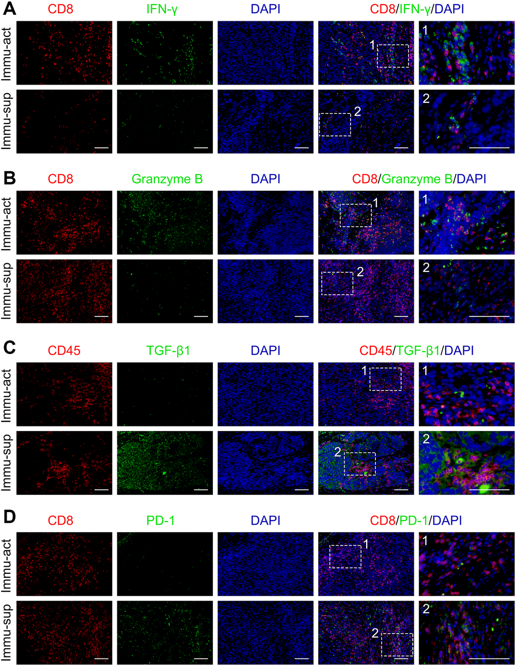 To validate the varied TME status, we probed the protein levels of markers representing immune activation and suppression in our collected clinical tumor samples by immunofluorescence staining. The immune-activated and -suppressed subclasses were screened from our collected tumor samples with RNA sequencing data using the NTP algorithm. The protein levels of IFN-γ and granzyme B co-staining with CD8+ T cells were upregulated in the immune-activated patients compared with those in the immune-suppressed patients (Figure 3A, 3B). Notably, the TGF-β1+CD45+ or PD-1+CD8+ double-positive cells were higher in the immune-suppressed patients than in the immune-activated patients (Figure 3C, 3D). Collectively, the immune class could be further subdivided according to the component of TME, implicating that immune-suppressive signaling and immune-suppressive cell elimination could potentially improve anti-cancer immunotherapy in patients with immune-suppressed status.