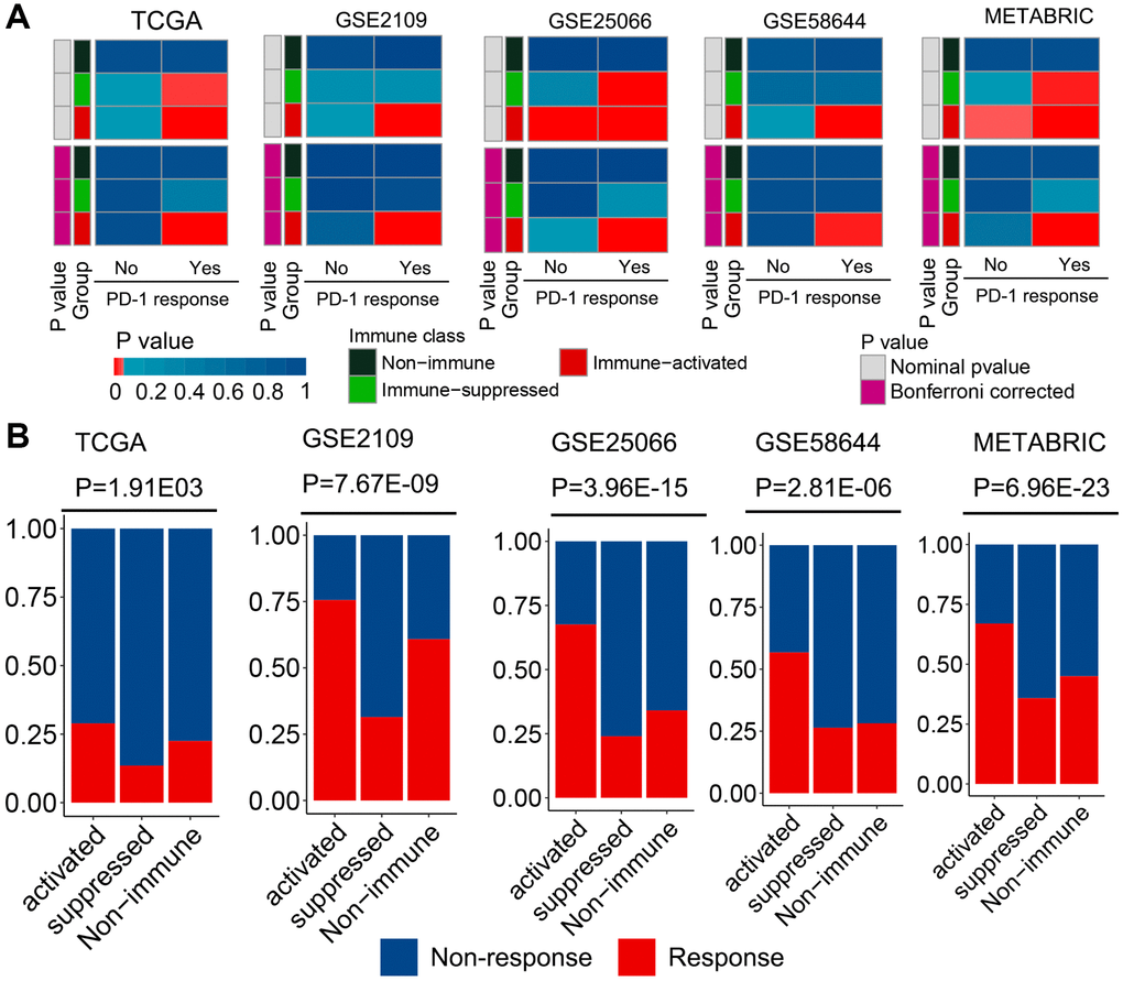 For a newly defined immunophenotype, its guidance in clinical treatment is a concern. Therefore, the potential of our immunophenotype classification system to predict ICI treatment response was evaluated in all cohorts. The mRNA expression profile similarity between patients with breast cancer and those with melanoma receiving anti-PD-1 treatment was calculated using a submap algorithm. Notably, patients in the immune-activated subclass presented higher mRNA expression profile similarity with those who responded to anti-PD-1 treatment than patients in the other two groups (Figure 4A). These results indicate that patients in this subclass can gain more benefits from anti-PD-1 immunotherapy. Tumor immune dysfunction and exclusion (TIDE) is a well-accepted algorithm for evaluating a patient’s response to ICI treatment based on tumor expression profile data [25]. The results of TIDE revealed that patients in the immune-activated subclass had a higher predicted response rate than those in the other two groups (Figure 4B). Collectively, these results indicated that patients in the immune-activated subtype could be candidate patients for receiving ICI treatment.