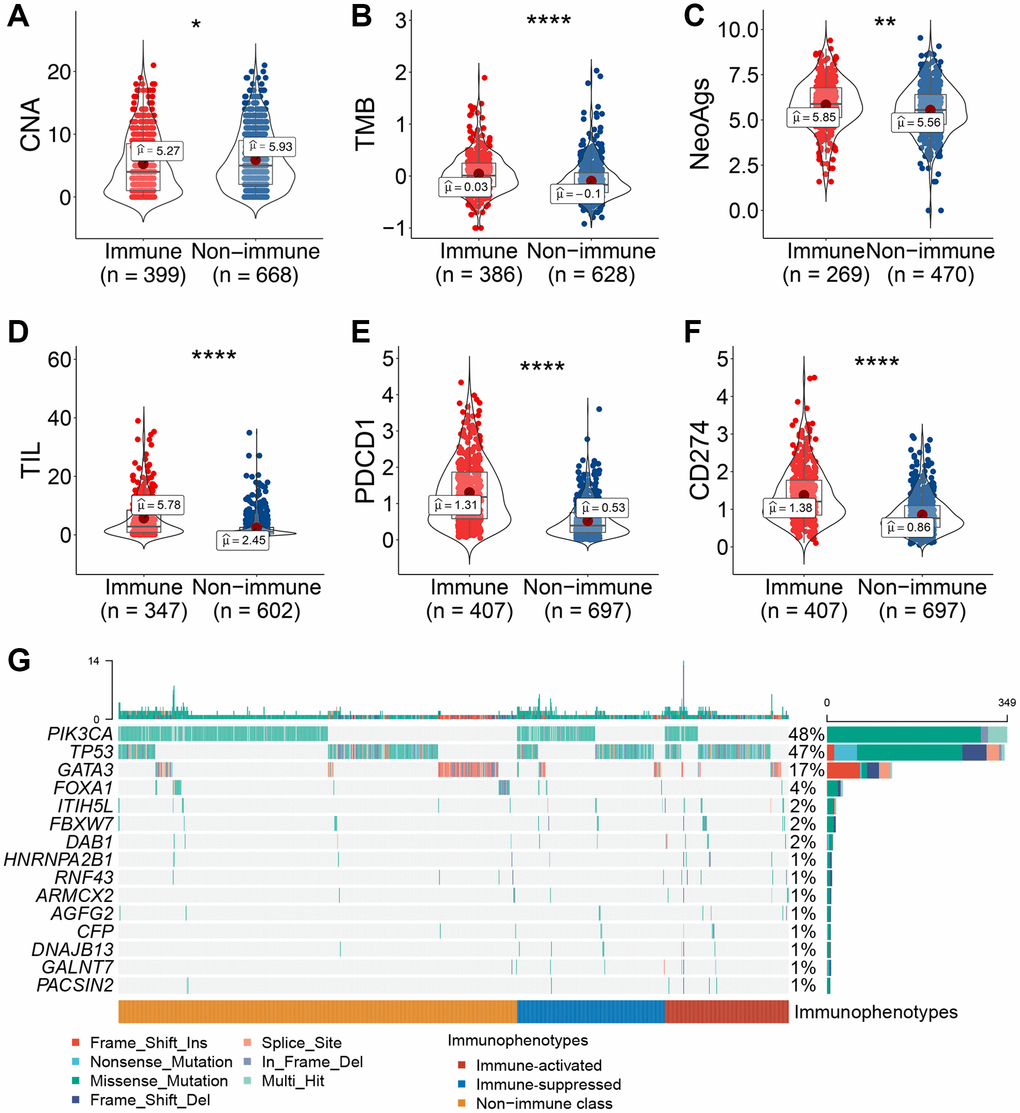 CNAs, TMB, NeoAgs, and TILs were compared between the immune and non-immune subclasses. GDAC Firehose (https://gdac.broadinstitute.org) provided CNAs as calculated using GISTIC2.0 for use by researchers. Additionally, in a previous study, Saltz et al. [43] evaluated the abundance of TILs through hematoxylin and eosin-stained images of TCGA samples. The TMB was calculated using the maftools (v2.6.05) package based on TCGA–BRCA mutation data (http://xena.ucsc.edu/). NeoAg for individual patients in the training cohort was obtained from a previous study by Rooney et al. [44]. In addition, to identify genes with differential mutations among the three immunophenotypes, we first used the MutSigCV (v1.41) package to predict significant cancer-related mutated genes (P < 0.01) based on the mutation data, and then used independent tests to screen the differential mutation genes. Finally, we used maftools to display the mutation landscapes of the immunophenotypes.