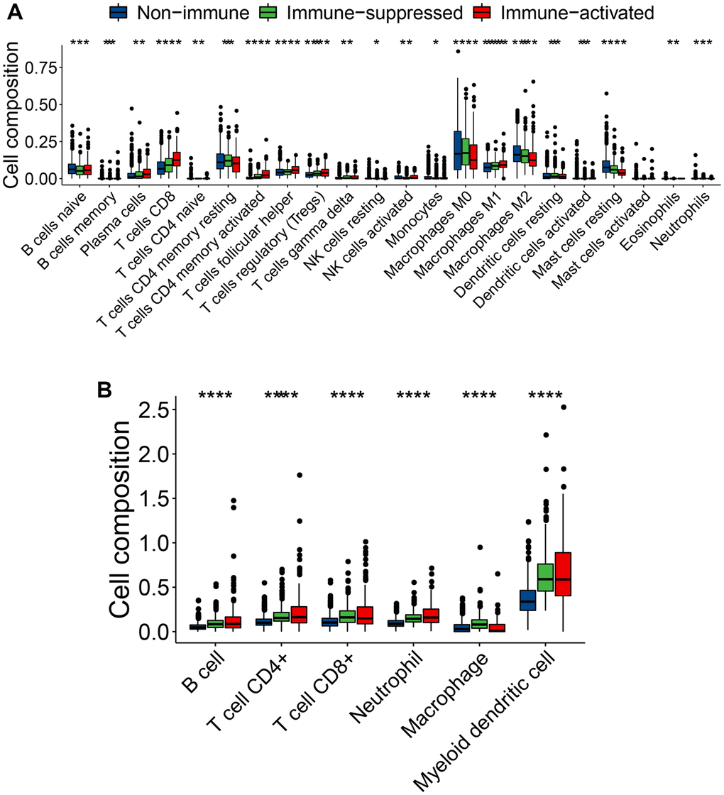 We used the top 150 DEGs between immune and non-immune classes in the training cohort as the classifier. The NMF and ESTIMATE algorithms were performed to dichotomize the validation cohorts into immune and non-immune classes. The NTP method was conducted to further divide the immune class into immune-activated or -suppressed subclasses.