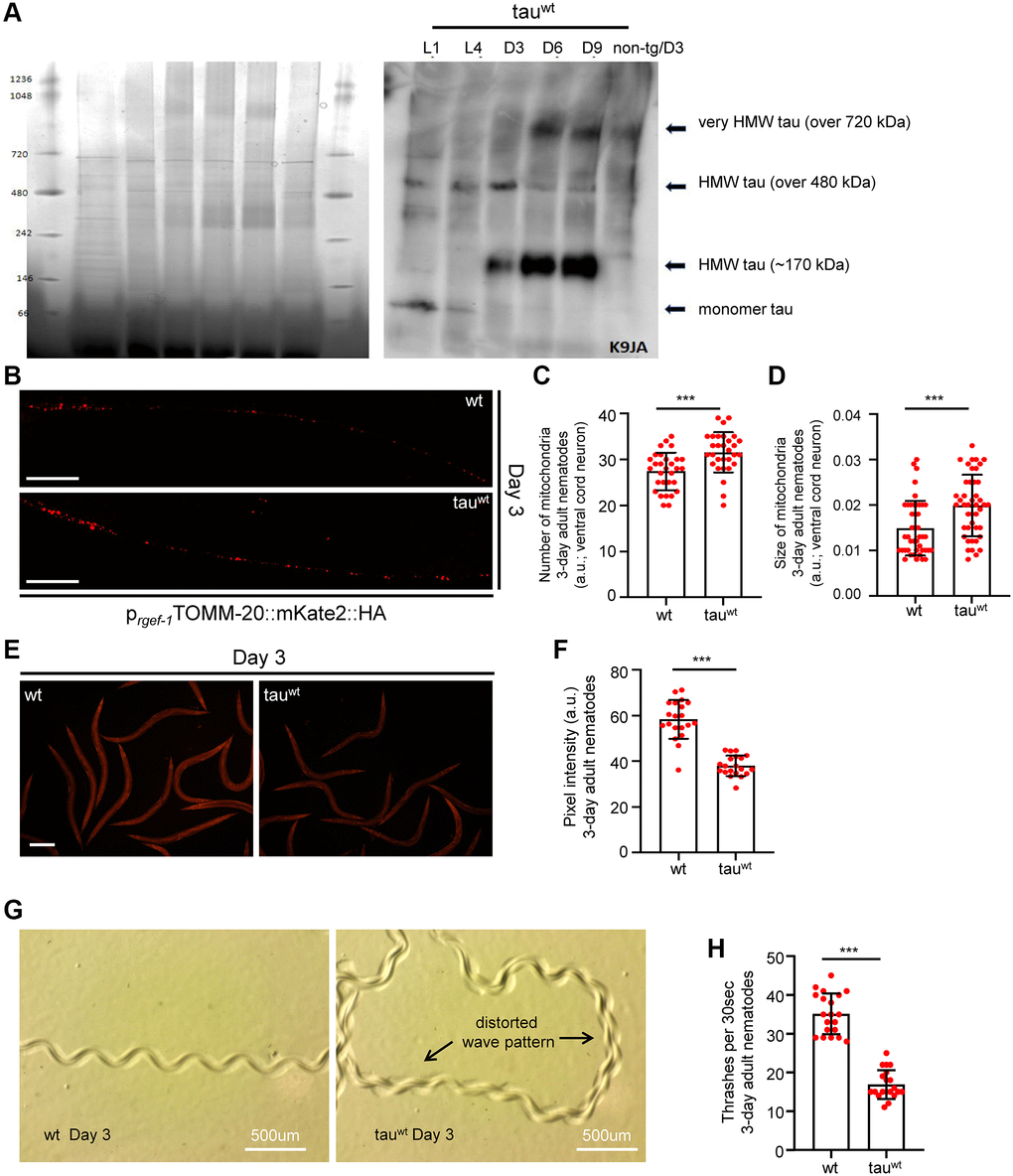 To investigate the impact of tau on mitochondrial activity, neuronal function and organismal physiology, we utilized an already characterized nematode strain that expresses the full length of wild type human tau protein under the control of the pan-neuronal promoter of the snb-1 gene (the nematode synaptobrevin homologue) [29]. To avoid possible toxic effects of tau overexpression, we used a transgenic nematode strain expressing wild type tau at low levels (tauwt-low; PIR3, henceforth tau-expressing nematodes), which display mild phenotypic abnormalities [29]. We collected age-synchronized worms and performed total tau protein extraction from the transgenic nematodes to assess the formation of tau oligomers and aggregates over time. We found that high molecular weight tau oligomers started to accumulate from day three of adulthood and gradually increased in C. elegans neurons with age (Figure 1A and Supplementary Figure 1A–1B). Accumulation of tau protein with age was not due to altered transcriptional activity of the tissue specific snb-1 promoter (Gene Expression Omnibus (GEO) dataset GSE832 [30]).