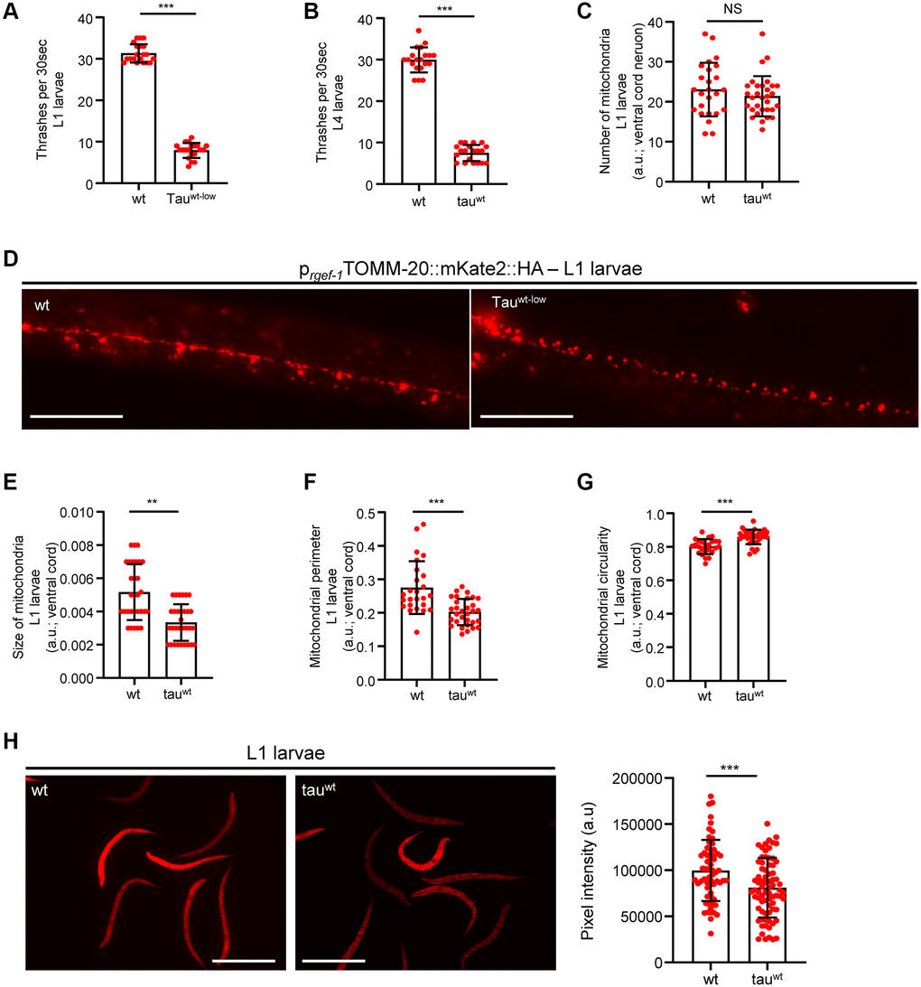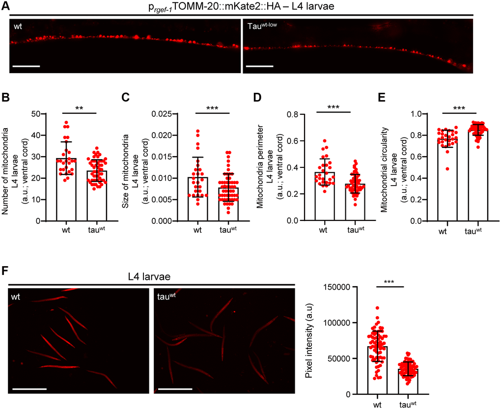 To investigate whether the locomotion deficits were generated because of excessive mitochondrial damage, we evaluated several aspects of mitochondrial morphology, including size, perimeter and circularity, which have been used to evaluate mitochondrial dysfunction [48–51]. Tau-expressing larvae presented smaller and more globular mitochondria compared to the wild type counterparts (Figure 2E–2G, Figure 3C–3E and Supplementary Figure 3C–3E, 3H). Moreover, mitochondrial membrane potential assessment of the tau-expressing nematodes displayed fewer active organelles indicating that tau expression is sufficient to alter not only the shape of mitochondrial networks but also their activity during early development (Figure 2H and Figure 3F). These results indicate that increased mitochondrial damage and impaired energy generation might drive neuronal dysfunction and the abnormal locomotion of the tau-expressing nematodes and highlight mitochondrial defects as an early pathological feature of tauopathy.