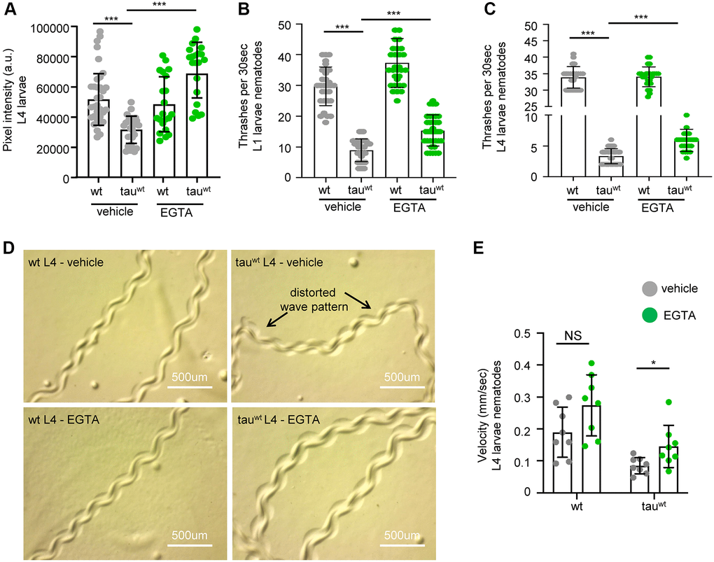 A recent study in C. elegans demonstrated that overexpression of a mutant isoform of tau (tauA152T) promoted necrotic cell death of glutamatergic neurons through dysregulation of the cytosolic calcium levels [56]. Therefore, we examined whether calcium deregulation is implicated in the impairment of mitochondrial activity in the tau-expressing nematodes. Interestingly, supplementation with 10 mM EGTA, a calcium chelating agent, restored mitochondrial membrane potential in tau-expressing animals without any detectable effect on wild type worms (Figure 4A). Moreover, the bending behavior, the sinusoidal wave pattern and the velocity of tau-expressing L4 larvae were improved following calcium chelation without any substantial effect on the behavior in wild type (Figure 4B–4E and Supplementary Figure 4A). However, EGTA treatment could not rescue the severe motility defect in the tau-expressing nematodes during adulthood (Supplementary Figure 4B). Moreover, EGTA supplementation did not affect tau oligomer and aggregate formation, suggesting that calcium chelation solely impacts mitochondrial homeostasis (Supplementary Figure 5A–5B). These findings suggest that tau expression results in altered calcium homeostasis enhancing neuronal vulnerability to degeneration during aging, and demonstrate tight interplay between tau overexpression, calcium homeostasis, and mitochondrial function, in neuronal health.