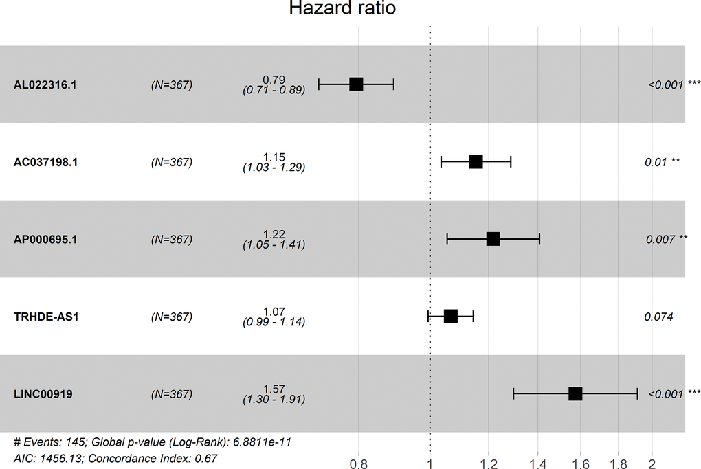 A forest plot showed the hazard ratio of five lncRNAs. The P value of this model was 6.8811E-11 and the C-index was 0.67 (Figure 1).