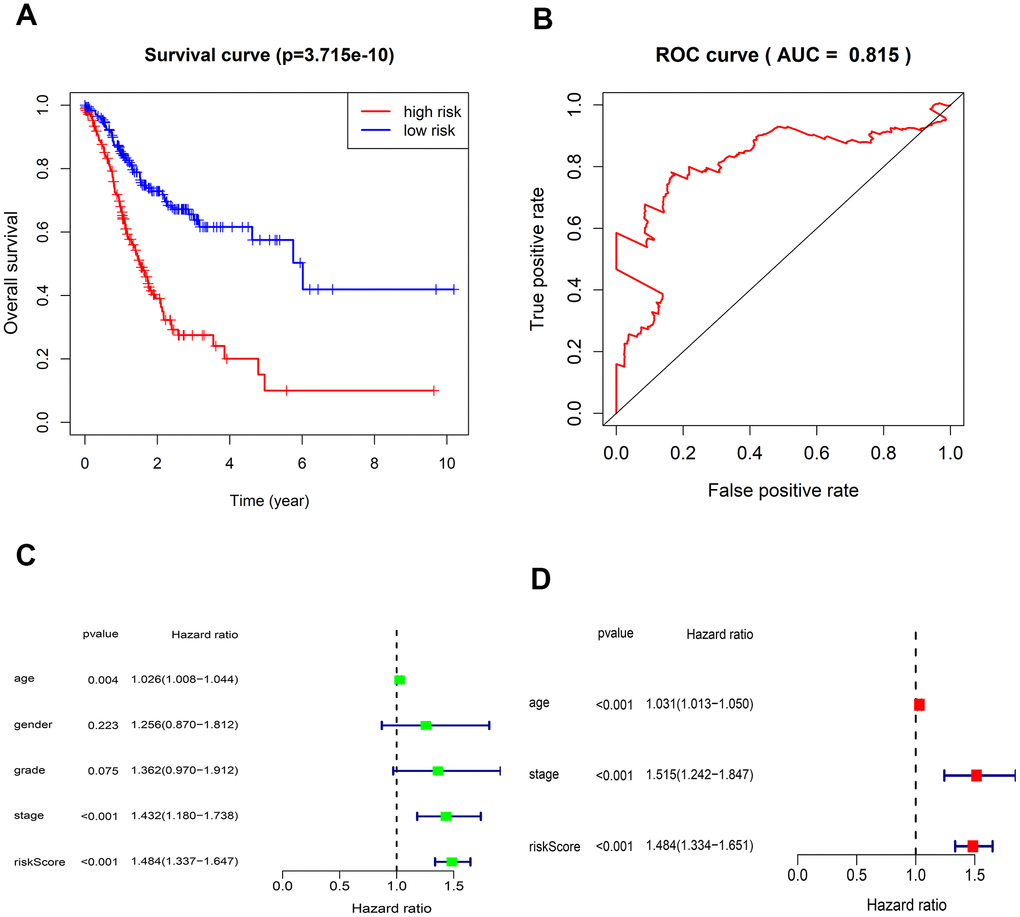 The risk value of each patient was calculated according to the scoring formula of the model. And patients were divided into high- and low-risk groups with the median risk value. Survival curves of the high- and low-risk groups were made by K-M method. Meanwhile the ROC curve of the prognostic model was drawn, and its AUC value was calculated. The consistency test on AUC value was performed using R package "survcomp." Univariate and multivariate cox regression analyses were to determine whether the prognostic model is an independent factor or not. Finally, the risk curve of the prognostic model was obtained based on the risk score ranking.