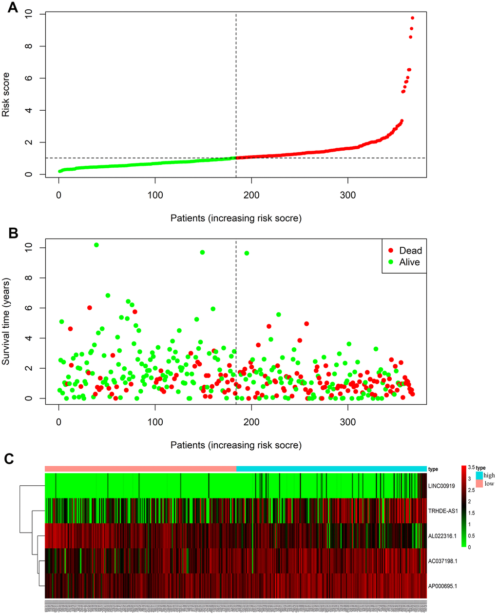 Risks scores were sorted in order (Figure 3A), and we found that survival time of patients decreased and mortality rate increased as the risk value increased (Figure 3B). Moreover, expressions of the 4 lncRNAs (AC037198.1; AP000695.1; TRHDE-AS1; LINC00919) were negative to the risk score. While the expression of lncRNA (AL022316.1) was positive to the risk score.