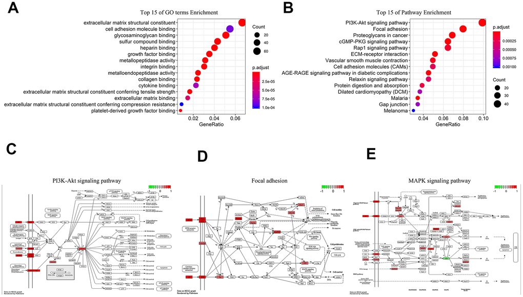 We performed Gene Ontology (GO) and Kyoto Encyclopedia of Genes and Genomes (KEGG) analyses on 1197 co-expression proteins of 5-lncRNA. GO illustrated that the 5-lncRNA prognosis model had 55 GO terms, and the first 15 were shown in Figure 4A, mainly containing extracellular matrix structural constituent and biomolecules binding. The 5 lncRNAs act on 36 major pathways, the most 15 pathways were shown in Figure 4B, mainly including PI3K-AKT signaling pathway (Figure 4C), Focal adhesion (Figure 4D), MAPK signaling pathway (Figure 4E). These 5 lncRNAs affect the progress of GC through the high expression of related signaling pathway proteins.