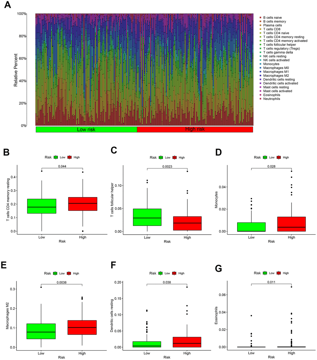 And the result of 22 immune cells in GC from the TCGA were exhibited in Figure 5A. Specific immune cells in high-risk patients are activated, such as T cells CD4 memory resting, Monocytes, Macrophages, Dendritic cells resting and Eosinophils (Figure 5B, 5D–5G). Only T cell follicular helper immune cells were highly expressed in the low-risk group (Figure 5C).