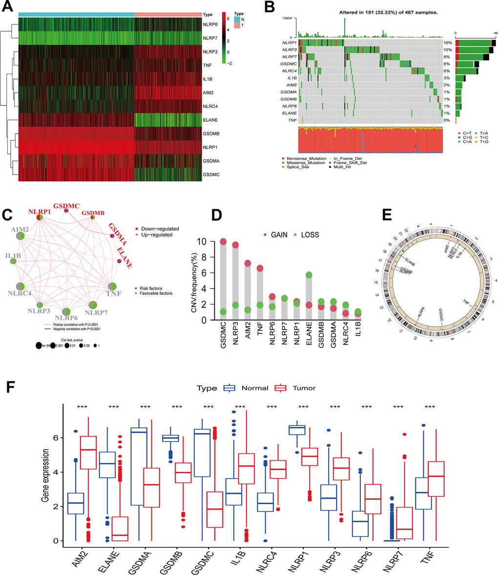 In this study, 12 differentially expressed PRGs - seven upregulated (AIM2, IL1B, NLRC4, NLRP3, NLRP6, NLRP7, TNF) and five downregulated PRGs (ELANE, GSDMA, GSDMB, GSDMC, NLRP1) - were screened for analysis (Figure 1A). We first investigated their CNV and mutations frequency in TCGA-CM. Among 467 TCGA-CM samples, 151 cases experienced PRG mutations, with a 32.33% mutation frequency. The top three highest mutation frequencies PRGs were: NLRP3 (10%), NLRP6 (10%), and NLRP7 (9%) (Figure 1B). Further analyzing PRGs prognostic role, we found that TNF and AIM2 were significantly associated with the CM patients’ overall prognosis. The PRG network diagram depicted an integrated landscape of PRG interactions and connections and their prognostic significance in CM patients (Figure 1C). From the CNV analysis results, CNV alteration was prevalent in the 12 PRGs, which showed mainly copy number amplification: AIM2, NLRP3, TNF, and GSDMC; while ELANE showed significant copy number reduction (Figure 1D). The 12 PRGs locations on the chromosome CNV changes are shown in Figure 1E. To understand if the PRGs expression was influenced by the genetic variants described above in CM patients, the PRGs levels between the samples from CM patients and normal skin tissues were determined. Our results showed that the alterations of CNV could be the prominent factors resulting in perturbations on the PRG regulators expression. (Figure 1F). Compared with normal skin tissue, CNV-amplified PRGs expression was significantly higher in CM (e.g. AIM2, NLRP3, NLRP6, TNF) and vice versa (e.g. ELANE, GSDMA, GSDMB) (Figure 1D, 1F). This analysis revealed significant PRG inheritance heterogeneity and variation between normal skin tissue and CM samples, suggesting that the expression imbalance of PRG played a crucial role in the occurrence and progression of CM.