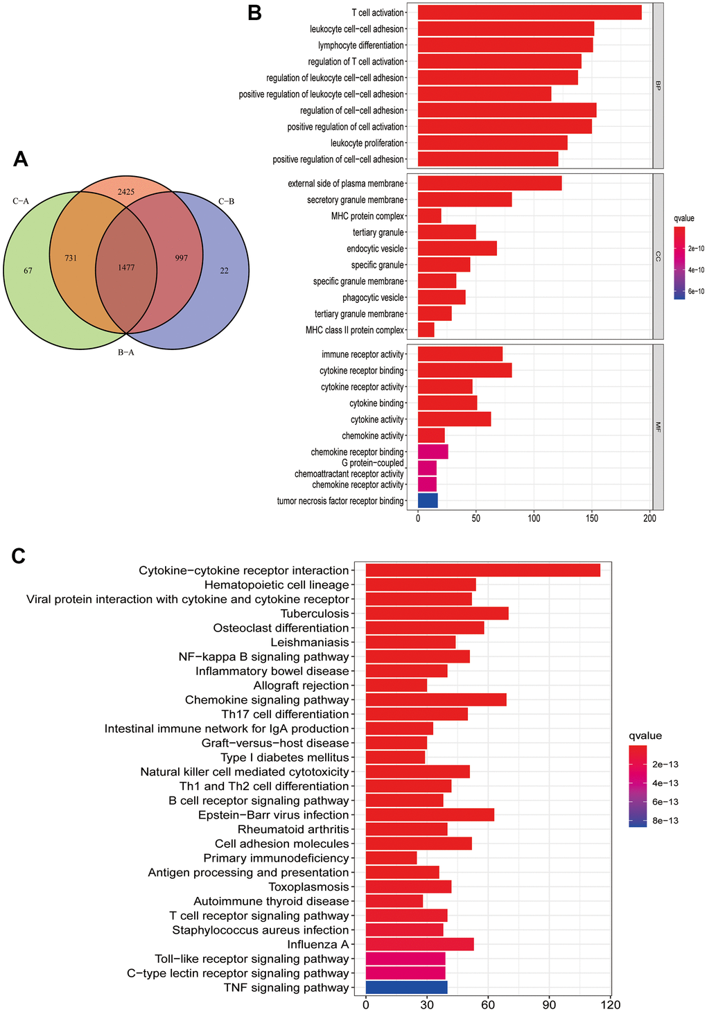 The TCGA-CM data with complete OS information were integrated with the GSE65904 dataset into a meta-queue (n = 657). To classify CM patients into different subclusters, based on the 12 PRGs expressions in the meta-queue, we performed unsupervised cluster analysis using the “ConsensusClusterPlus” R package. Finally, CM patients were classified into three independent subclusters: PRG cluster A, PRG cluster B, and PRG cluster C; according to the principle of minimal crossover between cluster strata (Figure 2A–2C). Survival analysis between the three independent PRG clusters showed that cluster B had a significant survival advantage, followed by C, and finally A (Figure 2D). The transcriptome PCA between the three PRG modification patterns showed significant differences in transcription regarding different subclusters (Figure 2E). To further clarify the PRG modification patterns’ characteristics in different biological functions and clinical features, we provided systematic and comprehensive clinical annotations. These 12 PRGs were most highly expressed in cluster B, followed by C and, finally, A (Figure 2F). Subsequently, we applied GSVA enrichment analysis to explore the biological behavior among different PRG clusters. Significant PRG cluster B enrichment in pathways related to immune cell activation was observed, including, apoptosis, chemokine, natural killer cell-mediated cytotoxicity, T-cell receptor, and B-cell receptor-related signaling pathways (Figure 3A, 3B). Interestingly, the same cellular function pathways showed a diminished enrichment trend in clusters C and A (higher enrichment in C than A). Next, we used ssGSEA analysis to assess TME immune cell infiltration between different PRG clusters. Interestingly, a significant difference in immune cell content was observed between PRG subclusters. Moreover, almost all immune cells were significantly enriched in cluster B, followed by cluster C, and, finally, cluster A. Enriched cells included activated B, CD4, CD8 T cells, and immature B cells, similar to the GSVA enrichment result (Figure 3C). Furthermore, CM patients in this PRG cluster B modification pattern exhibited a matched prognostic advantage (Figure 2D). Previous studies have shown that tumor immunity is influenced by many factors, such as tumor type, host, and environment. In the cancer-immune cycle context, these factors are defined as immune phenotypes that can predict the tumor immunotherapy efficacy [25]. Altogether, cluster B was abnormally rich in innate immune cell infiltration - such as activated CD4, CD8, B cells, immature B cells - and matching favorable prognosis. Therefore, we hypothesized that the high immune cells content in PRG cluster B exerts an anti-cancer effect mediated by chemokines and exhibits a prognostic advantage - which corresponds to a tumor immune inflamed phenotype with the best immunotherapy response. Similarly, the phenotype associated with immune exclusion (e.g. presence of immune cells around the TME) was involved in PRG cluster C, but does not exert anti-tumor effects and responds poorly to immunotherapy. The immune desert phenotype was involved in PRG cluster A, including the lack of immune cells infiltration in TME, lack of antigen presentation, and unresponsiveness to immunotherapy.