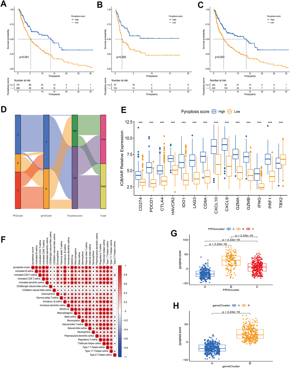 The PRG landscape quantitative indicators in CM patients were obtained by calculating two composite scores based on PRG phenotype genes using the PCA method: PC1 and PC2. The sum of PC1 and PC2 was defined as an independent score for each CM patient. Finally, we obtained a quantitative PRG landscape indicator for each CM patient, the pyroptosis score. Subsequently, according to the optimal score cutoff value, CM patients were divided into two groups: high and low pyroptosis score groups. Survival analysis in the TCGA-CM cohort showed that patients in the high-scoring group had better OS than those in the low-scoring group (Figure 6A). The same results were present in the GSE65904 cohort and the all-CM patients’ cohort (Figure 6B, 6C). Regression analysis indicated that pyroptosis score, age, T-stage, and N-stage were independent prognostic factors for OS in CM patients (Supplementary Table 2 and Supplementary Figure 1). The CM patients’ distribution in different modification patterns is shown in Figure 6D. Almost all PRG cluster B and gene cluster B patients were classified in the high pyroptosis score group, which was associated with a survival advantage. Further analysis revealed that pyroptosis scores differed significantly between PRG clusters and gene clusters. The highest median score was observed in PRG cluster B and the lowest in PRG cluster A (Figure 6G). From the above survival analysis, it could be seen that patients with high scores have a better overall prognosis (Figure 6A–6C). Therefore, we speculated that CM patients with PRG cluster B have a better prognosis and those with PRG cluster A have a worse one. This presumption is consistent with the results presented in Figure 2D. Similar speculations and conclusions were further validated (results shown in Figures 5D, 6H). Gene cluster B had a high pyroptosis score and a matched survival advantage (Figures 6H, 5D). After exploring the pyroptosis score prognostic value, we analyzed immune tolerance and activity in CM patients. First, we collected six immune checkpoint blockade (ICB) genes (CD274/PD-L1, CTLA4, PDCD1/PD-1, HAVCR2, IDO1, LAG3) and eight genes associated with the immune activation [Immune activation related (IAR): TBX2, PRF1, IFNG, GZMB, GZMA, CXCL9, CXCL10, CD8A] [23, 26]. We observed that all ICB genes were highly overexpressed in the high-scoring group. Also, ICA genes were overexpressed, except for TBX2, in the high-scoring group (Figure 6E). It is worth mentioning that ICB genes (CD274, CTLA4, PDCD1) are targets of anti-PD-1/PD-L1 and anti-CTLA4 antibody treatments. Therefore, we speculated that patients in the high pyroptosis score group are more suitable for immunotherapy. The correlation between pyroptosis score and TME immune cell infiltration was explored to provide preliminary validation. We found a positive correlation between pyroptosis score and the most innate immune cell infiltration levels, such as activated B, CD4 T, CD8 T, and dendritic cells, immature B cells (Figure 6F). High immune cell infiltration levels can provide a more potent anti-tumor effect, which may also explain why high pyroptosis score patients had a good prognosis.