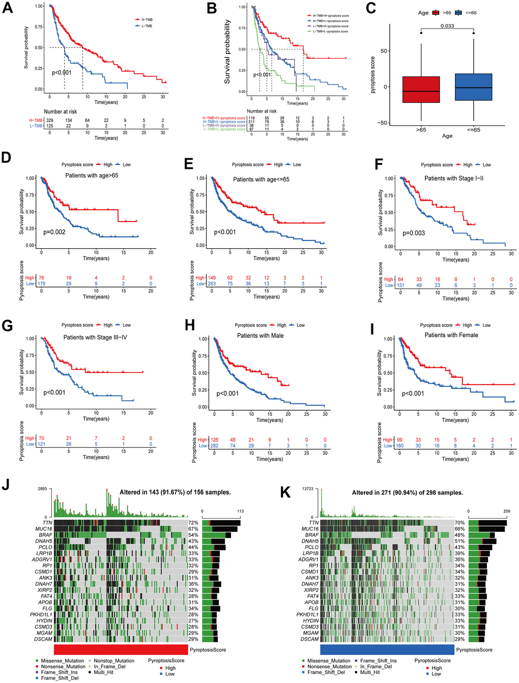 Evidence has demonstrated that tumors with high TMB are accompanied by correspondingly high CD8+ immune cell infiltration levels, thus acting as recognition and anti-cancer agent. This revealed that the TMB status is associated with the clinical response of patients receiving anti-PD-1/PD-L1 immunotherapy [27, 28]. High TMB alterations in tumors can enhance immunotherapy response and are associated with a long-term survival advantage and durable clinical benefits [6, 29]. Considering the TMB guiding significance in immunotherapy, we collected somatic mutation data of the TCGA-CM cohort to explore the relationship between CM-TMB and pyroptosis score. First, according to the optimal cutoff, patients in the TCGA-CM cohort were divided into a high and a low TMB group. Survival analysis showed that the OS between high and low TMB was significantly different, with patients in the high TMB cohort having longer OS than those in the low (Figure 7A). Next, we explored if there was a synergistic TMB and pyroptosis score effect in CM patients’ prognoses. Stratified survival analysis indicated that TMB levels did not affect the pyroptosis score independent predictive value. Significant differences existed between high and low TMB in pyroptosis score subclusters. Among patients with high pyroptosis scores, the OS was improved in high TMB patients compared to those with low TMB. Similarly, in the low pyroptosis scores group, high TMB patients had superior OS than low TMB ones (Figure 7B). Then, we analyzed the distribution of the somatic mutations in the TCGA-CM cohort between high and low pyroptosis scores using the “maftools” R package [30]. The top 20 driver genes with the highest mutation frequencies in the high and low pyroptosis score groups, and the corresponding mutation frequencies, are shown in Figure 7J, 7K. A broader TMB was observed in the high pyroptosis score group compared with the low one. These findings might provide new insights for immune checkpoint blockade therapy under pyroptosis phenotypic regulation mode.