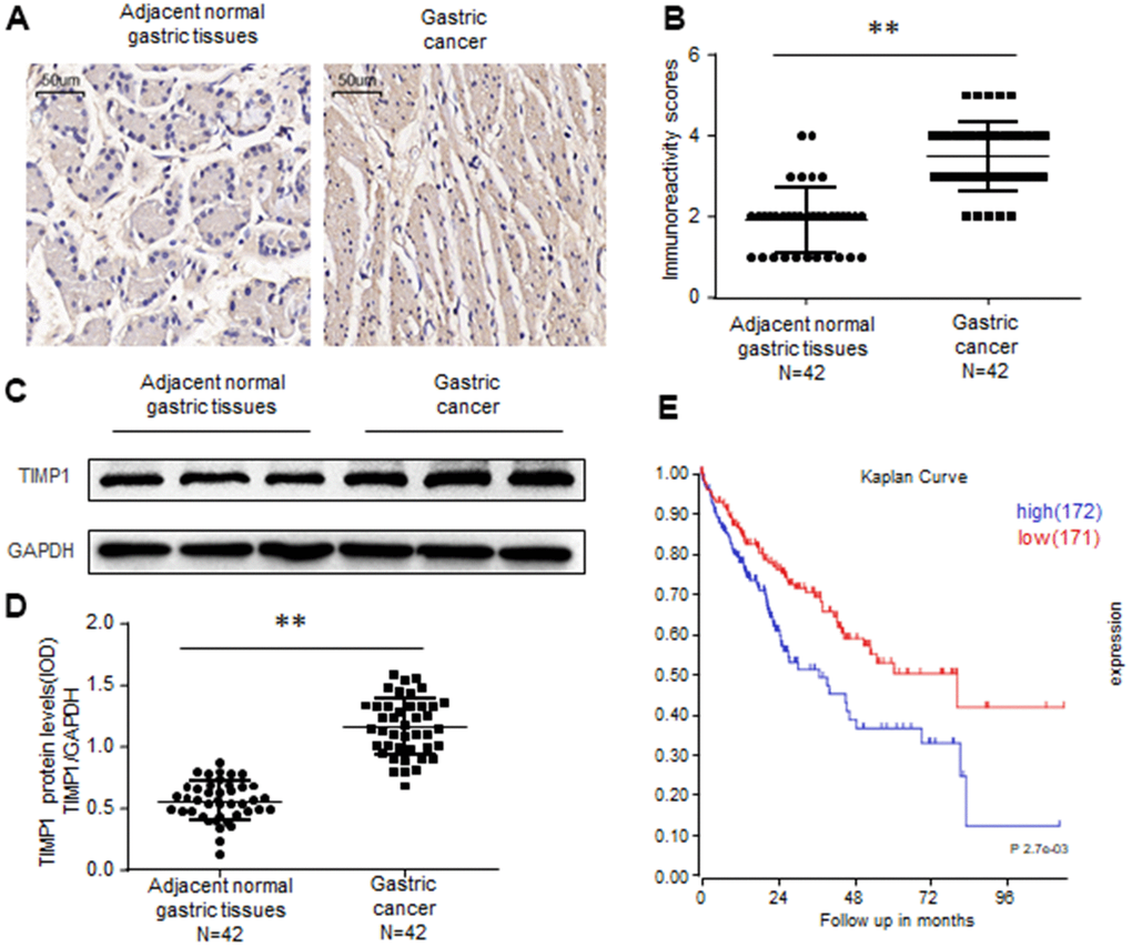 To investigate whether TIMP1 is upregulated in Gastric Cancer (GC), we first examined TIMP1 expression in 42 cases of GC and 42 adjacent normal gastric tissues. Immunochemistry revealed that, compared with control colon tissues TIMP1 was upregulated in gastric cancer tissues (Figure 1A, 1B). By testing the frozen gastric tissues, we also found that TIMP1 increased in protein levels (Figure 1C, 1D). Kaplan-Meier analysis showed that high levels of TIMP1 expression are associated with poor overall survival rates of GC patients. In summary, these findings indicate that TIMP1 expression is upregulated in GC tissues.