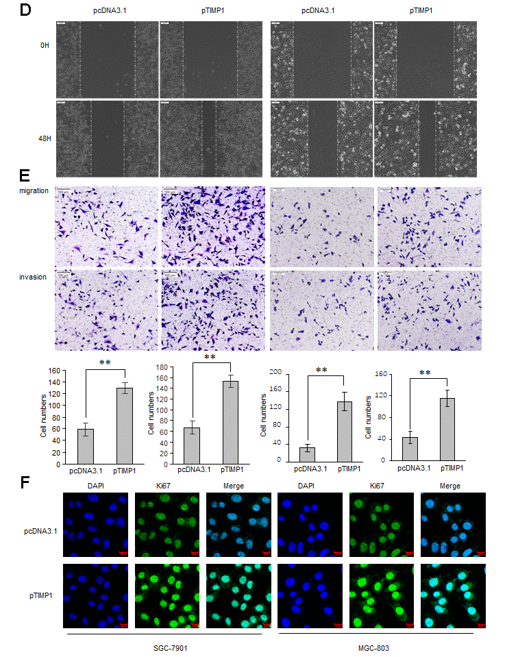 To explore the biological function of TIMP1 in the development of GC, GC cells were transduced with siRNAs targeting TIMP1 or TIMP1 overexpression plasmid. Our results showed that, compared with control cells, the proliferation ability was significantly improved in TIMP1 overexpression cells (Figure 2A–2C), and inhibited in TIMP1 knockdown cells (Supplementary Figure 1A–1C). Wound healing assay and Transwell showed that, TIMP1 promotes GC migration and invasion (Figure 2D, 2E and Supplementary Figure 1D, 1E). Increased expression of Ki67 indicated that TIMP1 significantly promoted GC cell proliferation (Figure 2F). Subsequently, inhibiting the expression of TIMP1 can also cause a decrease in the expression of Ki67 (Supplementary Figure 2F).