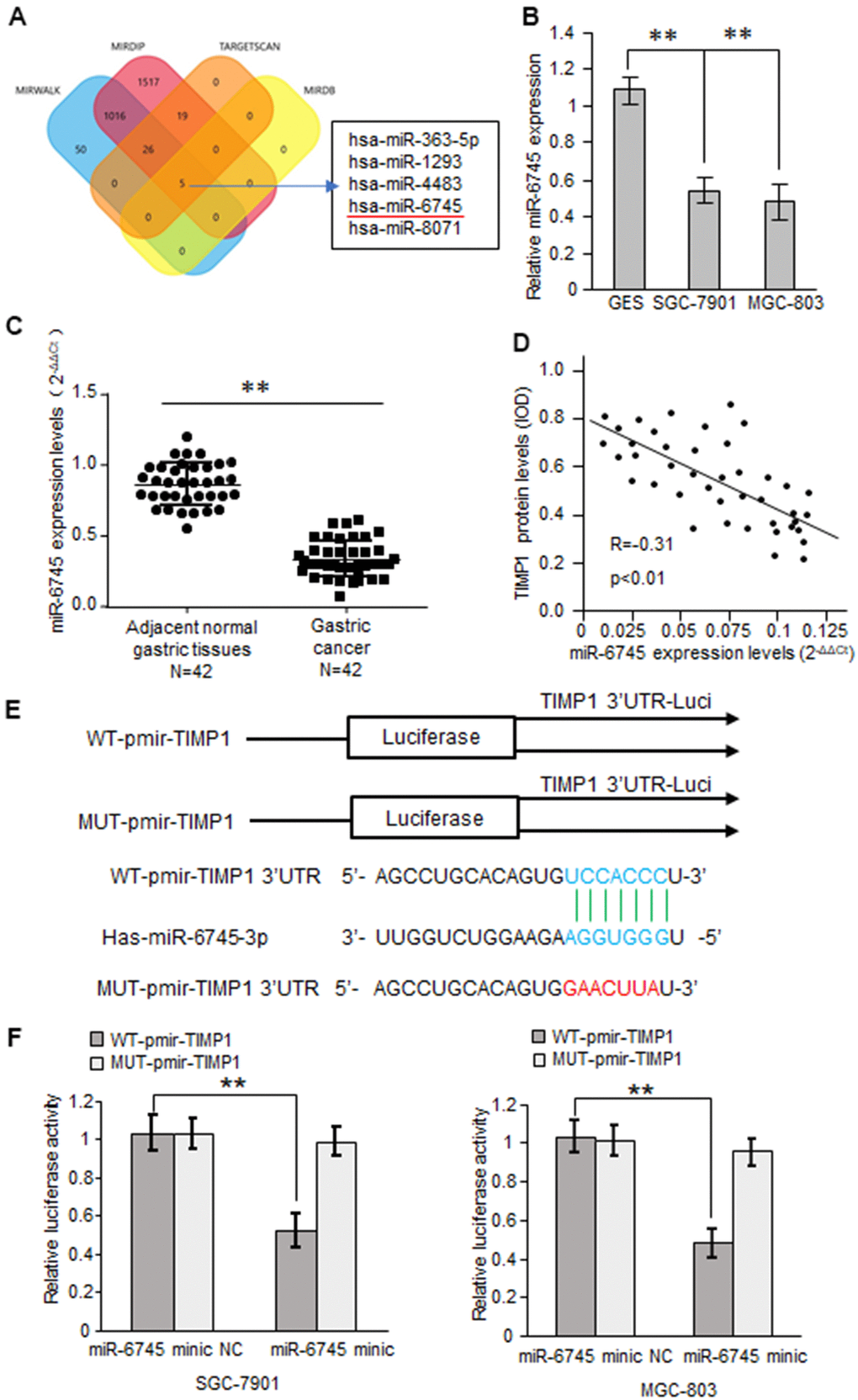 Based on bioinformatics analysis, we predicted 5 potential binding miRNAs in TIMP1 3'-UTR (Figure 3A). Real-time RT-PCR results showed that the expression of miRNA-6745 was reduced in GC cells (Figure 3B). Through the detection of 42 cases of GC tissues and 42 adjacent normal gastric tissues, we found that miR-6745 was significantly reduced in GC tissues (Figure 3C). In addition, we found that TIMP1 protein levels were negatively correlated with miR-6745 levels in GC tissues (Figure 3D). To explore whether miR-6745 directly binds to the TIMP1 3'-UTR, dual-luciferase reporter assays were performed (Figure 3E). The results showed that miR-6745 repressed luciferase activity of Wt-TIMP1 3′UTR, but not Mut-TIMP1 3′UTR (Figure 3F). These findings indicate that miR-6745 directly binds to the TIMP1 3'-UTR.
