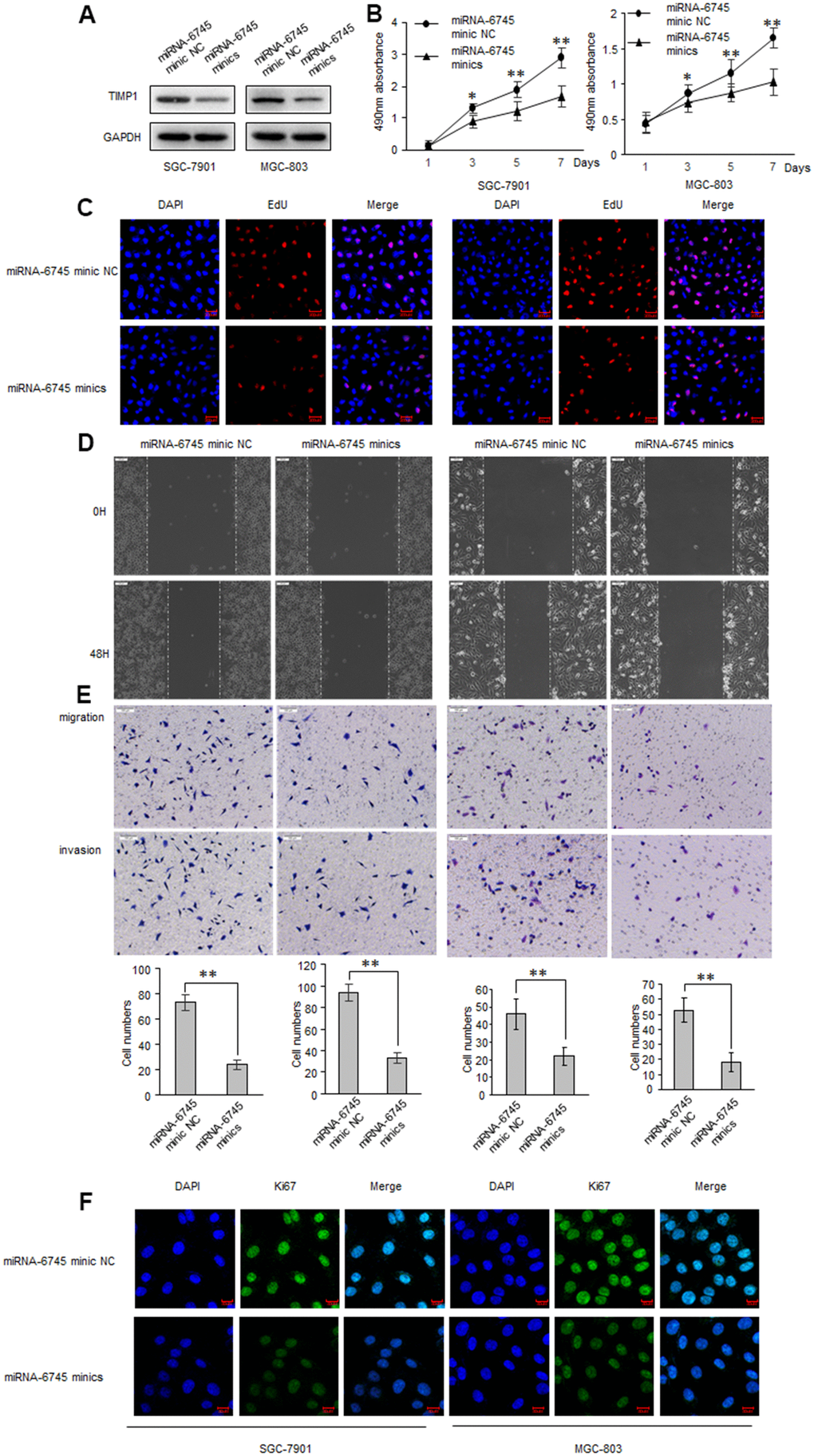 TIMP1 promotes the GC process, and TIMP1 is the direct target of miR-6745, we then investigated whether miR-6745 have a similar effect on GC tumorigenesis? GC cells were transduced with miR-6745 mimics or miRNA-6745 mimic NC. Firstly, EdU incorporation assay and MTS assay were performed to assess GC cells growth and found that miR-6745 obviously decreased cell proliferation (Figure 4A–4C). Wound-healing and transwell assays were performed in GC cells, as shown in Figure 4D, 4E, the invasive and migratory ability were significantly reduced after transfected with miR-6745 mimics. Immunofluorescence staining also showed that miR-6745 also reduce the expression of KI67 (Figure 4F).