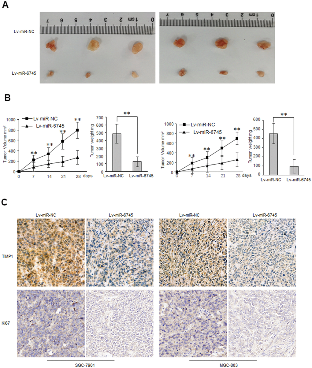 To explore the biological functions of miR-6745 on GC cell proliferation and metastasis in vivo, we constructed two GC cell lines (Lv-miR-6745-SGC-7901 and Lv-miR-6745- MGC-803) that stably overexpresses miR-6745. Then we injected Lv-miR-6745 or Lv-miR-NC cells subcutaneously into nude mice. All mice were euthanized and stripped of tumor at 28 days after the experiment, the average tumor volumes and weights in Lv-miR-6745 group were smaller than Lv-miR-NC group (Figure 5A, 5B). Immunochemistry showed that that TIMP1 and Ki67 were significantly decreased in the Lv-miR-6745 group (Figure 5C). These results indicate that miR-6745 can inhibit tumorigenesis in vivo.