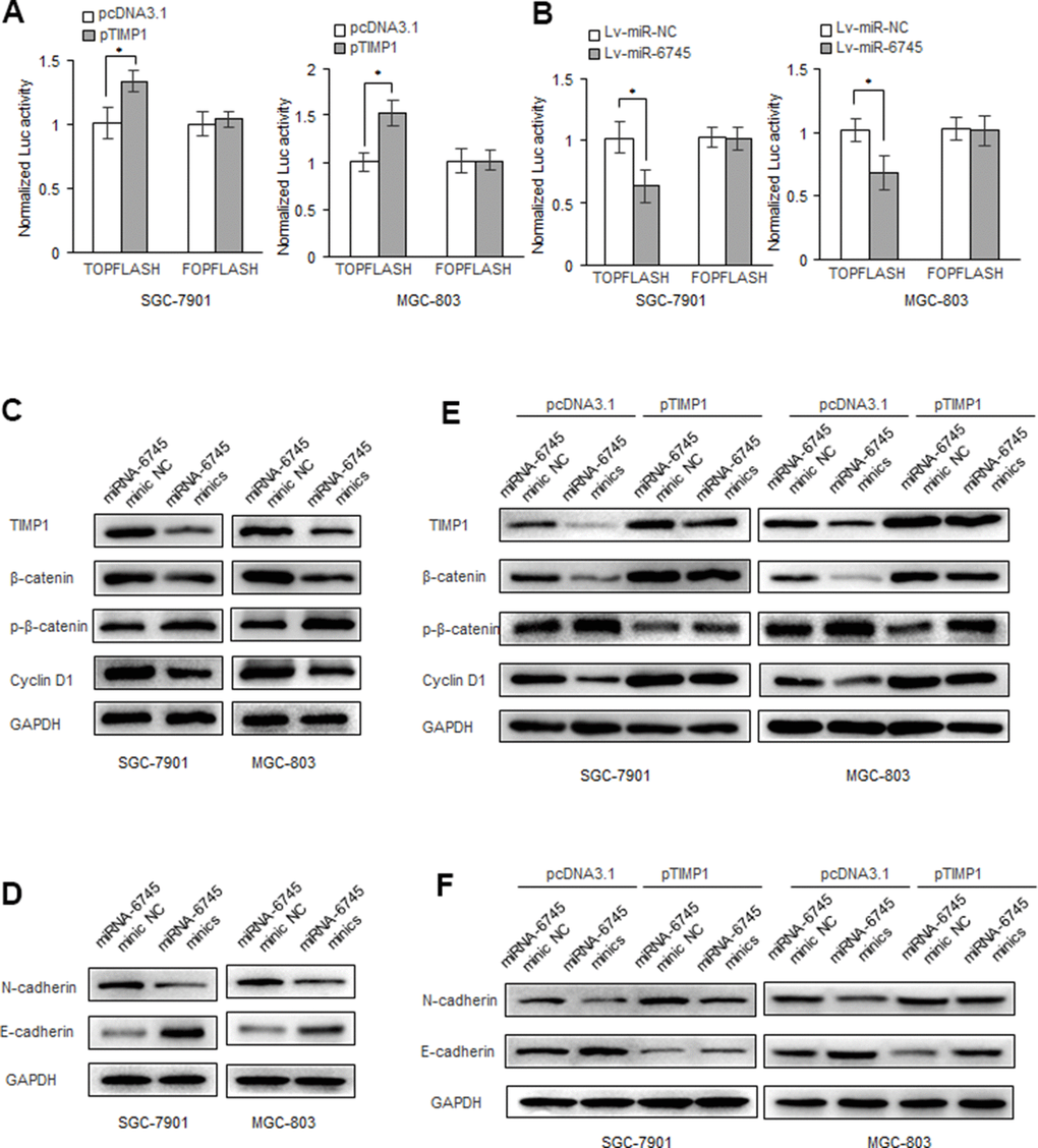 Overwhelming evidences had demonstrated that Wnt/β-catenin signaling play key roles in cancer proliferation, metastasis, and survival [18–20]. We found that TIMP1 can enhance the activity of the β-catenin reporter gene in GC cells (Figure 6A), while miR-6745 has the opposite effect (Figure 6B). And we found that miR-6745 overexpression or TIMP1 knockdown decreased the expression of total β-catenin in GC cells, and increased the level of phosphorylated β-catenin. In addition, we found that the overexpression of miR-6745 inhibited the levels of N-cadherin and cyclin D1 and increased the expression of E-cadherin (Figure 6C, 6D). And we found that TIMP1 can partially restore the expression of phosphorylated β-catenin, β-catenin, N-cadherin, E-cadherin and cyclin D1 regulated by miR-6745 (Figure 6E, 6F).