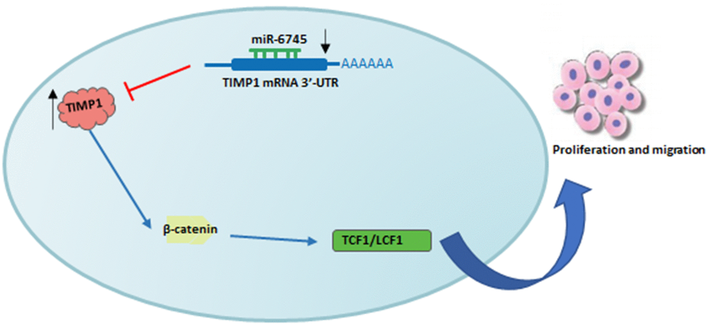 In summary, we found that the downregulation of miR-6745 in GC tissues was negatively correlated with the high expression of TIMP1. As summarized in Figure 7, miR-6745 can inhibit the occurrence and development of GC by directly targeting TIMP1 to regulate downstream Wnt/β-catenin signaling. Therefore, we provide a new strategy for the prevention, diagnosis and treatment of GC.