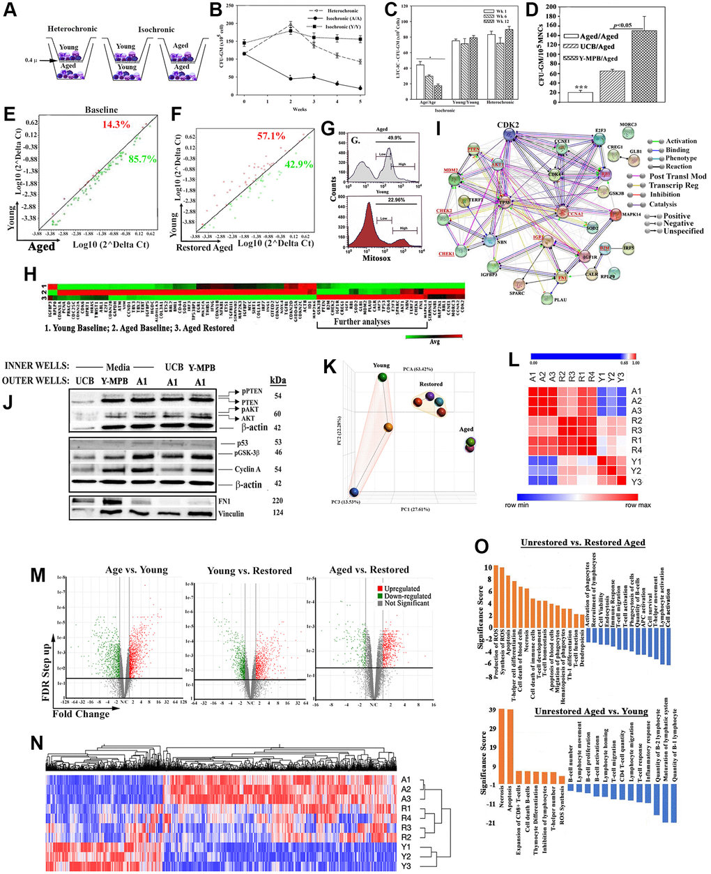We examined global changes with RNA-Seq by comparing the following: restored and unrestored age cells, and young MPBs. Principle component analyses (PCA) showed distinct clustering among the groups (Figure 1K). Although one young donor was not within the cluster of the other two young donors, similarity matrix showed the restored samples moving closer to the young profile (Figure 1L). Applying a false discovery rate (FDR) cutoff of <0.05, we selected 2,140 genes, visualized in volcano plots and hierarchical clustering (Figure 1M and 1N). Since the hierarchical plot was established with >2,000 genes, we conducted additional analyses to understand the molecular changes with the restored aged MPBs.
