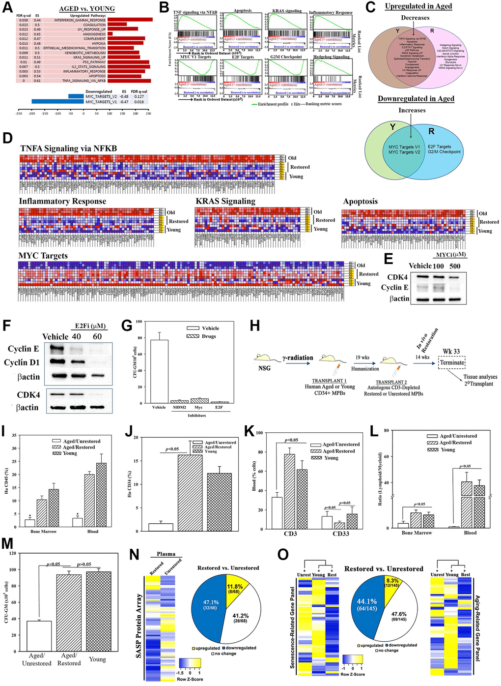 Ingenuity pathway analyses (IPA) identified top pathways associated with hematopoietic development and, decreases in reactive oxygen species, apoptosis and necrosis (Figure 1O). Gene Set Enrichment Analysis (GSEA) identified significantly up- and down-regulated (FDR q value < 0.05) pathways in age and young groups (Figure 2A and 2B). MYC pathways were the only downregulated targets in the age group with 14 upregulated pathways. Restoration improved key age-related functions - inflammation, immune suppression and cell death - TNFα signaling, NFκB signaling, apoptosis and p53. The Venn diagram depicts the pathways corrected by restoration along with the shared and unique pathways (Figure 2C). The up- and down-regulated pathways in the aged samples transitioned into the overlapping section with young following restoration. Heatmaps are shown for the enriched sections of the top shared pathways (Figure 2D and Supplementary Figure 2J).