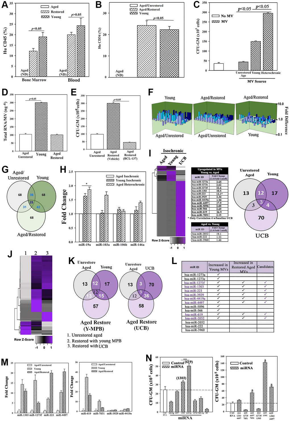 We sought the causative miRNA(s) using an 84-probe array. MVs from isochronic (young and aged) and heterochronic co-cultures showed distinct miR profiles with 25 shared among the groups (Figure 3F and 3G). IPA predicted targets for the differentially expressed miRs and indicated a functional network in which young miRs are poised to prevent aging disorders such as cancer and hematological disorders (Supplementary Figure 4H). MiR-19a, -103a, -106b and -146a were upregulated in the young and restored MVs. Since qPCR only validated miR-19a in the young and restored cells (Figure 3H), we conducted further analyses by RNA-Seq of small RNA within the MVs. Using an expression cut-off of 100 mappable reads, we identified 13 and 17 unique miRs in aged and young MVs, respectively (Figure 3I). 12/17 miRs were higher in young vs. aged, while 3/17 were lower (Figure 3I, middle). The miRnome of MVs from UCB was vastly different with 70 miRs in >100 mapped reads but only 4 shared with young MPBs (Supplementary Figure 4I). Similarly, there were differences in intracellular miRnomes among aged, young, and UCB (Supplementary Figure 4J). Importantly, after restoration with young MPBs or UCB cells, there were common miR profiles in the heterochronic cultures, indicating that aged cells could be driving the MV cargo secreted from young cells (Figure 3J–3K, Supplementary Figure 4K–4O).