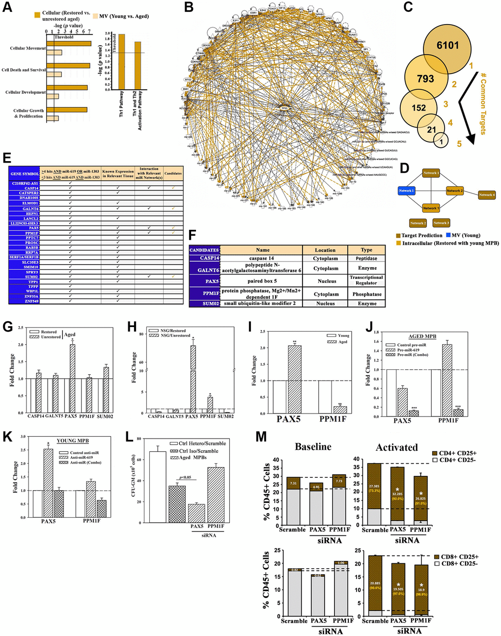 Functional studies used aged MPBs, transfected with PAX5 or PPMIF siRNA or scramble siRNA followed by clonogenic assay for CFU-GM. PAX5 siRNA caused a significant (p < 0.05) decrease in CFU-GM whereas PPM1F siRNA significantly (p < 0.05) increased CFU-GM (Figure 4L). Positive control with heterochronic cultures resulted in the expected colonies. Knockdown of PAX5 and PPM1F led to T-cell activation, which is in line with improved lymphoid functions during restoration (Figure 4M).