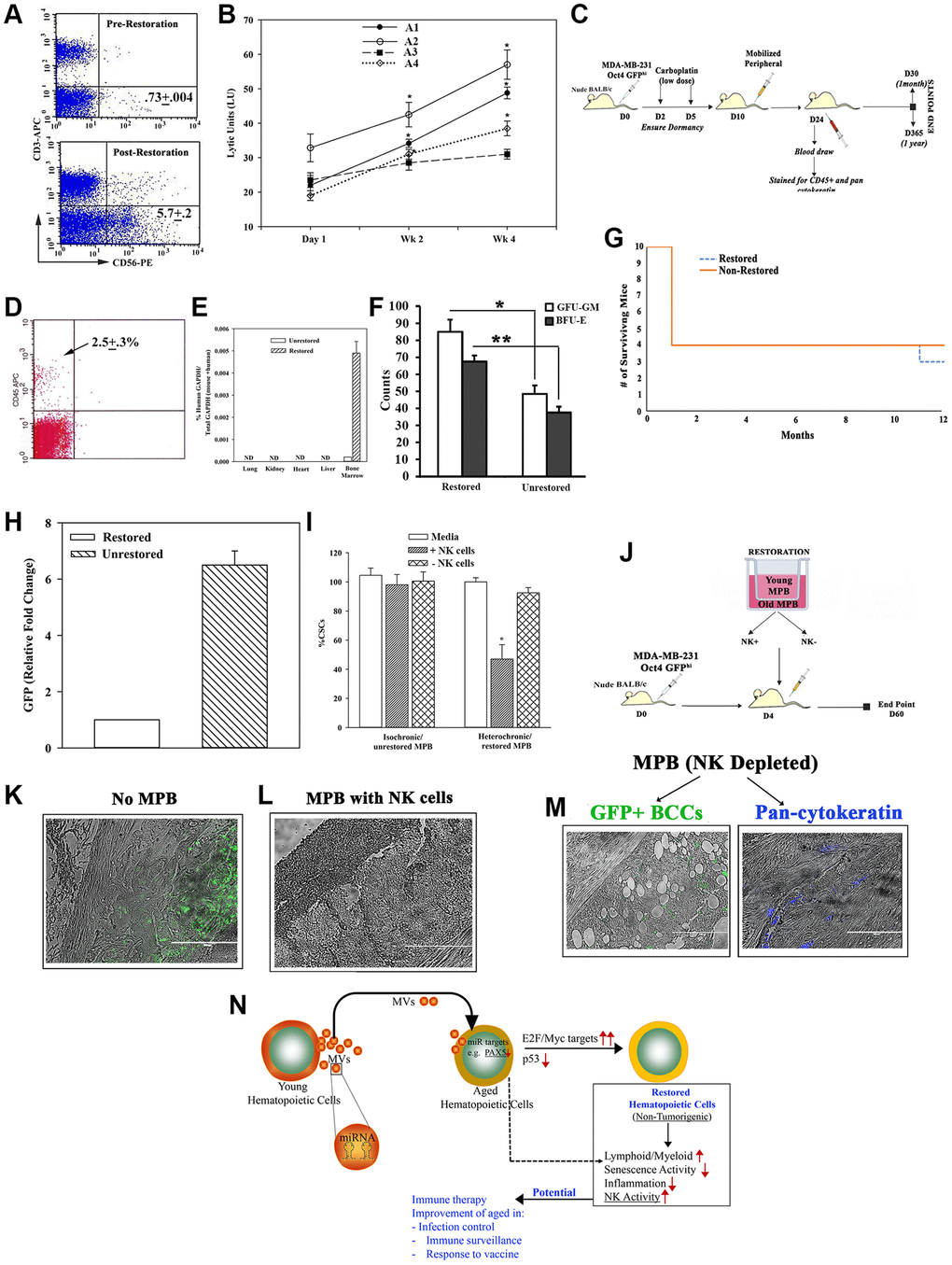 Nude female BALB/c mice (6 wks) were injected with CSCs for established dormancy in femurs as described [53]. The CSCs were isolated as outlined above. Mice with dormant cancer cells were injected with 106 restored or unrestored aged MPBs. After one month, mice were studied for human chimerism and GFP cells were analyzed by real time PCR for GFP. Groups of 10 mice were followed for one year for survival.