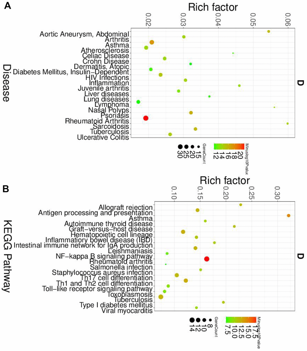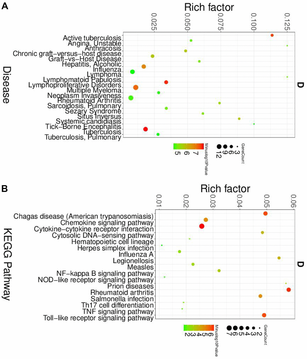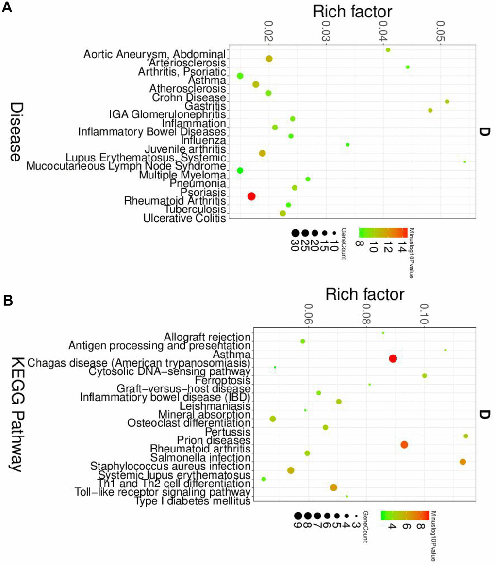 Next, we analyzed the roles and macrophage and dendritic cells in the pathogenesis of SLE. Similar to the neutrophil, the GO and KEGG analyses were performed. The disease enriched analysis showed that the DEGs in macrophages were directly involved in the SLE (Figure 4A), and the results were further confirmed by the GO analysis results (Supplementary Figure 4). The KEGG results showed that the DEGs in macrophages would affect the Th1 and Th2 cell differentiation (Figure 4B). The differentiation status of Th1 and Th2 cells was correlated with the SLE [20]. Therefore, the DEGs in macrophage plays a vital role in the pathogenesis of SLE.