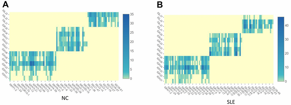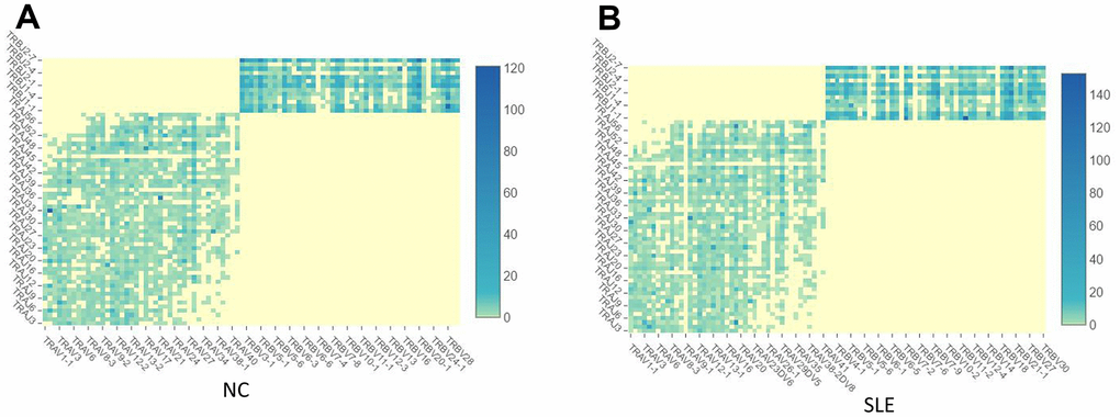 The immune repertoire can be used for either diagnostic marker or therapeutic targets. Using the Cell Ranger pipeline, we identified 5167 clonotypes from 5847 barcodes in SLE patients, 4259 clonotypes from 4654 barcodes in NC, suggesting that the TCR clonotypes was increased in the SLE compared to NC (Figure 6). In addition, the usage of the VDJ gene in both TCR α and β chains was biased between these two groups (Figure 7). For example, the most used V gene in TCRα was TRAV40 in NC, whereas it was TRAV16 in SLE. The most usage TCR clonotype was shown in Supplementary Figure 6A (CALSGDSNYQLIW_CASSPRPGNTEAFF).