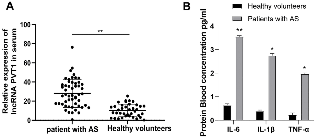 We first detected PVT1 expression in the serum of 52 AS patients and 32 healthy people by qRT-PCR. It was found that PVT1 expression in AS patients was significantly increased relative to that in healthy people (Figure 1A) (p < 0.05). Besides, AS is regarded as an inflammatory condition in the arterial wall. So, we measured the levels of IL-6, IL-1β, and TNF-α in the serum of AS patients and healthy people with ELISA kits. The results demonstrated that levels of IL-6, IL-1β and TNF-α were substantially higher in AS patients than those in healthy people (Figure 1B) (p < 0.05).
