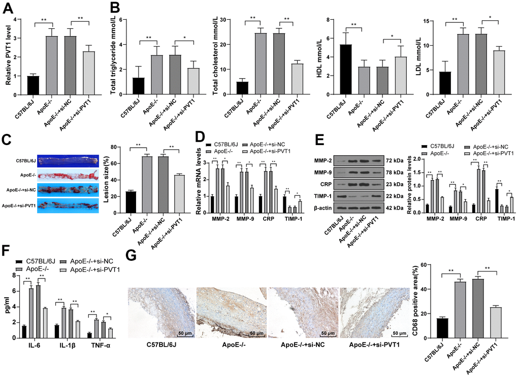 LncRNA PVT1 was reported to serve as an independent hazard factor in AS development and highly expressed in AS patients [9]. Therefore, the expression of PVT1 in mice was determined by qRT-PCR, which revealed that PVT1 expression in ApoE-/-mice was greatly elevated relative to that in wild C57BL/6J mice fed with normal diet (Figure 2A) (p < 0.05). After silencing PVT1, the serum levels of TG, TC, and LDL were significantly decreased and the serum level of HDL was elevated in ApoE-/-mice (Figure 2B) (p < 0.05). The oil red O staining exhibited that the number and size of AS plaques in ApoE-/-mice were evidently decreased after silencing PVT1 (Figure 2C) (p < 0.05). The results of qRT-PCR and Western blot analysis presented that levels of matrix metalloproteinase 2 (MMP-2), MMP-9, and CRP in AS plaques in ApoE-/-mice were notably decreased while levels of tissue inhibitor of metalloproteinase-1 (TIMP-1) were increased after silencing PVT1 (Figure 2D–2E) (all p < 0.05). ELISA results demonstrated that the levels of IL-6, IL-1β and TNF-α in ApoE-/-mice were obviously decreased (Figure 2F) (p < 0.05), and immunohistochemistry showed macrophages in ApoE-/-mice were significantly reduced after silencing PVT1 (Figure 2G) (p < 0.05). Briefly, silencing PVT1 reduces AS damage in ApoE-/-mice.