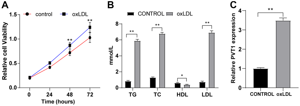 HA-VSMCs were treated for 24 h with 50 mg/mL oxLDL. MTT assay showed enhanced viability of HA-VSMCs after oxLDL treatment (Figure 3A) (p < 0.05). ELISA showed elevated levels of TG, TC and LDL and diminished HDL level in HA-VSMCs after oxLDL treatment (Figure 3B) (p < 0.05), indicating the presence of lipid metabolism disorder in HA-VSMCs after oxLDL treatment and successful establishment of AS cell model. The expression of PVT1 in oxLDL-treated HA-VSMCs was determined by qRT-PCR. We found highly expressed PVT1 in oxLDL-treated HA-VSMCs compared to that in untreated cells (Figure 3C) (p < 0.05). These results elicited that PVT1 is highly expressed in oxLDL-treated HA-VSMCs.