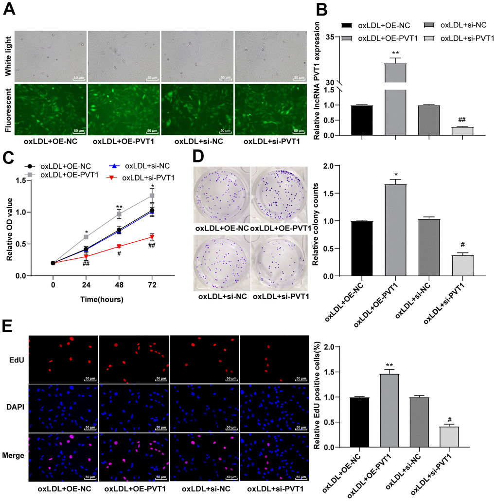 The abnormal proliferation of VSMCs contributes to plaque formation [14–17]. To investigate the involvement of lncRNA PVT1 in the abnormal proliferation of oxLDL-induced VSMCs, oxLDL-induced VSMCs were transfected with oe-NC, oe-PVT1, si-NC and si-PVT1, respectively. Green fluorescence was observed after 48 h of transfection (Figure 4A) (p < 0.05), and the expression of PVT1 was verified by qRT-PCR (Figure 4B) (p < 0.05). MTT assay indicated that the cell viability was notably facilitated at 24 h, 48 h and 72 h after PVT1 overexpression, and was obviously decreased after silencing PVT1 (Figure 4C) (p < 0.05). Colony formation assay showed clones were greatly increased after PVT1 overexpression, and were significantly decreased after silencing PVT1 (Figure 4D) (p < 0.05). EdU assay suggested that the positive rate of EdU was markedly augmented after PVT1 overexpression, and was decreased after silencing PVT1 (Figure 4E) (all p < 0.05). Altogether, silencing PVT1 inhibits the viability and proliferation of VSMCs.