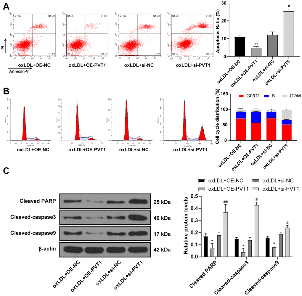 Furthermore, flow cytometry detected cell apoptosis and cell cycle, and showed less apoptotic cells with a large number of cells in S phase after PVT1 overexpression while apoptotic cells were significantly increased with diminished S phase cells and augmented G2/M phase cells after silencing PVT1 (Figure 5A, 5B) (all p < 0.05). Western blot analysis was used to detect the levels of cell apoptotic-related proteins and the results showed decreased levels of cleaved caspase-3, poly(ADP-ribose) polymerase (PARP), and cleaved caspase-9 after PVT1 overexpression and increased levels of cleaved caspase-3, PARP, and cleaved caspase-9 after silencing PVT1 (Figure 5C) (p < 0.05). Collectively, silencing PVT1 promotes apoptosis and cell cycle arrest of VSMCs.