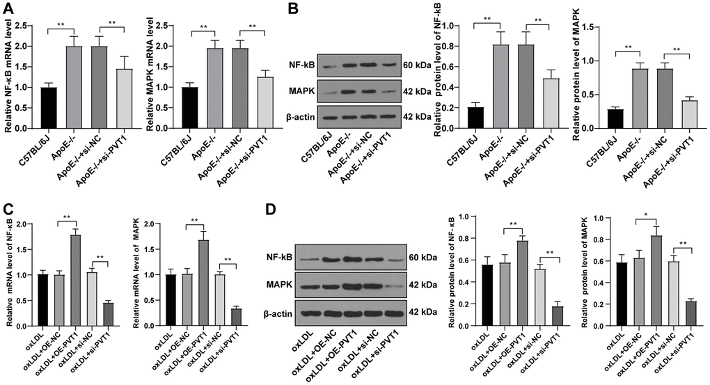Subsequently, the mRNA and protein levels of MAPK and NF-κB in oxLDL-treated HA-VSMCs were determined by qRT-PCR and Western blot analysis, and elevated levels of MAPK and NF-κB (Figure 6C) (p < 0.05), and decreased levels of MAPK and NF-κB were observed in the oxLDL + si-PVT1-treated cells (Figure 6D) (p < 0.05). These results confirmed that silencing PVT1 downregulates the MAPK/NF-κB signaling pathway in oxLDL-treated HA-VSMCs and AS mice.