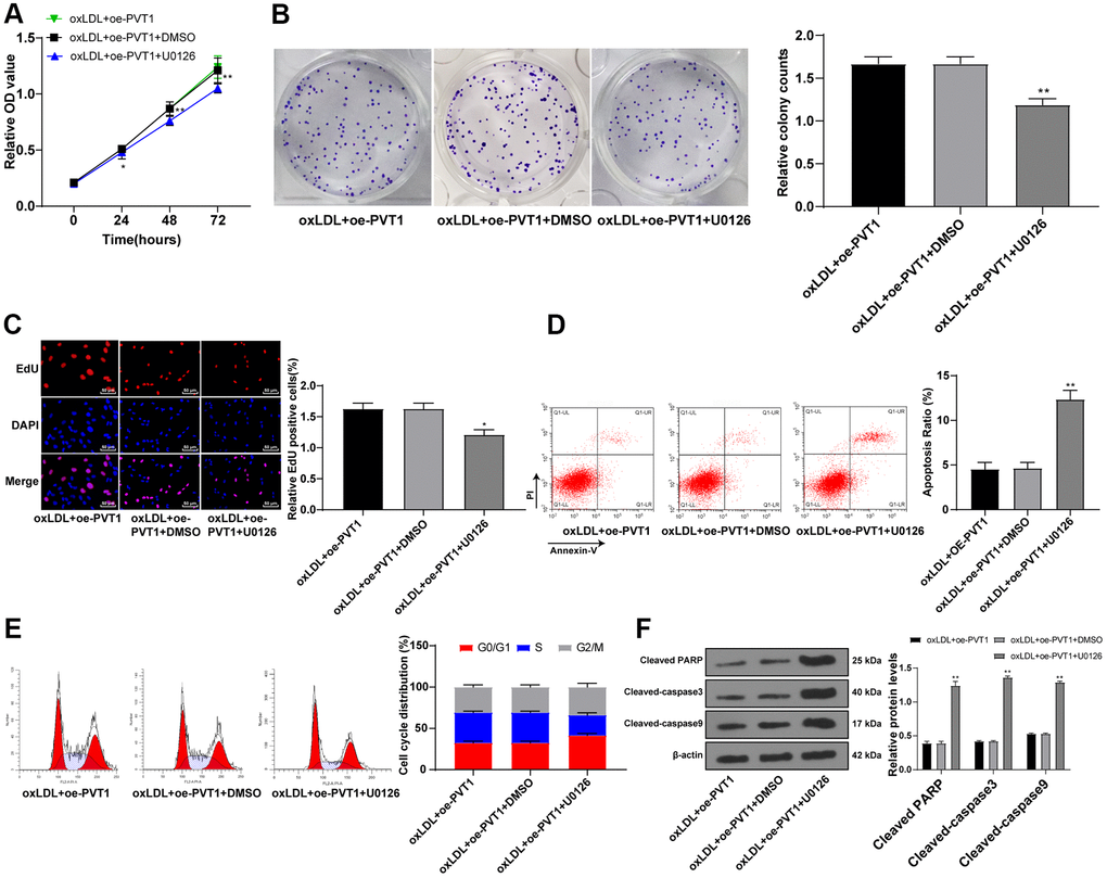 The aforementioned data unraveled that silencing PVT1 downregulated the MAPK/NF-κB pathway. Moreover, the inactivation of the MAPK/NF-κB pathway suppresses AS development [19–21]. To further confirm the effect of PVT1 on AS via the MAPK/NF-κB pathway, we added a specific inhibitor of MAPK, U0126, to oxLDL-treated HA-VSMCs after PVT1 overexpression. The results showed that the cell viability, cell clones and EdU positive rates of HA-VSMCs were noticeably downregulated afterwards (Figure 7A–7C) (all p < 0.05). The apoptotic cells and G2/M-phase cells were augmented while S-phase cells were reduced (Figure 7D, 7E) (p < 0.05). Western blot analysis exhibited an increase in levels of cleaved caspase-3, PARP and cleaved caspase-9 (Figure 7F) (all p < 0.05). The abovementioned results ascertained that silencing PVT1 suppresses AS development by downregulating the MAPK/NF-κB pathway.