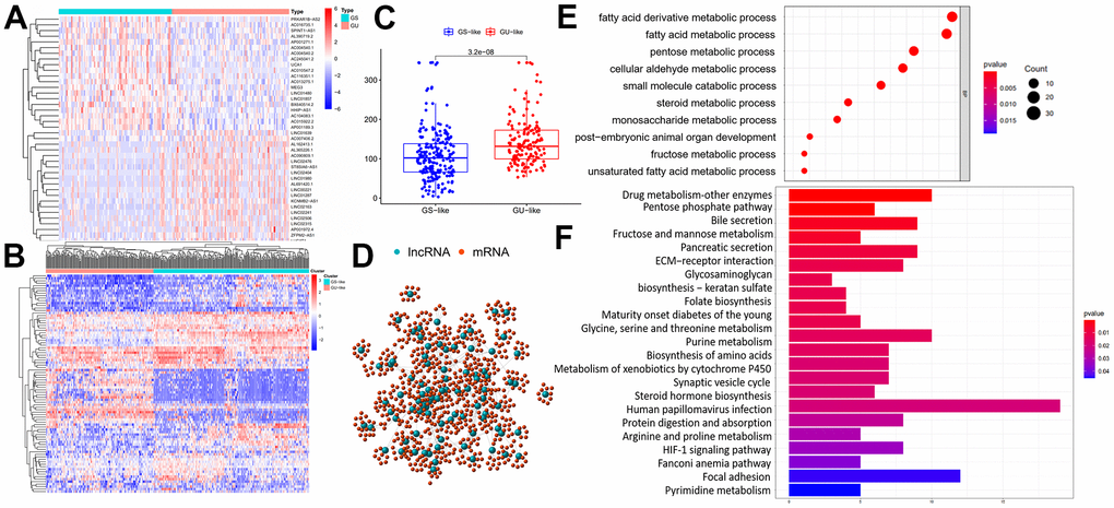 To validate the potential function of identified 88 lncRNAs and uncover their association with genomic instability, Gene Ontology (GO) terms and Kyoto Encyclopedia of Genes and Genomes (KEGG) analysis were carried out using clusterProfiler software in R-version 3.5.2. Firstly, protein coding genes (PCGs) closely related to the expression of lncRNAs were screened out using Pearson Correlation Coefficients. The top 10 PCGs most correlated with each lncRNAs were retained for lncRNAs–mRNA co-expression network construction. In the co-expression network, the nodes represented lncRNAs and mRNAs, and the lines represented the relationships between lncRNAs and mRNAs (Figure 1D). Go analysis of the PCGs in the network indicated that genomic instability might impact various metabolism process including fatty acid / fatty acid derivative metabolic process, pentose metabolic process, cellular aldehyde metabolic process, small molecule catabolic process and so on (Figure 1E). In terms of KEGG pathway analysis, PCGs in the network were found to enriched in a variety of metabolism pathway, HIF-1 signal pathway, extracellular matrix-receptor interaction, biosynthesis of amino acids and so on (Figure 1F). Enrichment results further reveal genomic instability-related lncRNAs were involved in various biological process of cancer. Expression of lncRNA could break the regulatory balance between lncRNA and PCGs, subsequently interfere with a variety of metabolism pathway, leading to gene damage repair process and exacerbation of genomic instability.