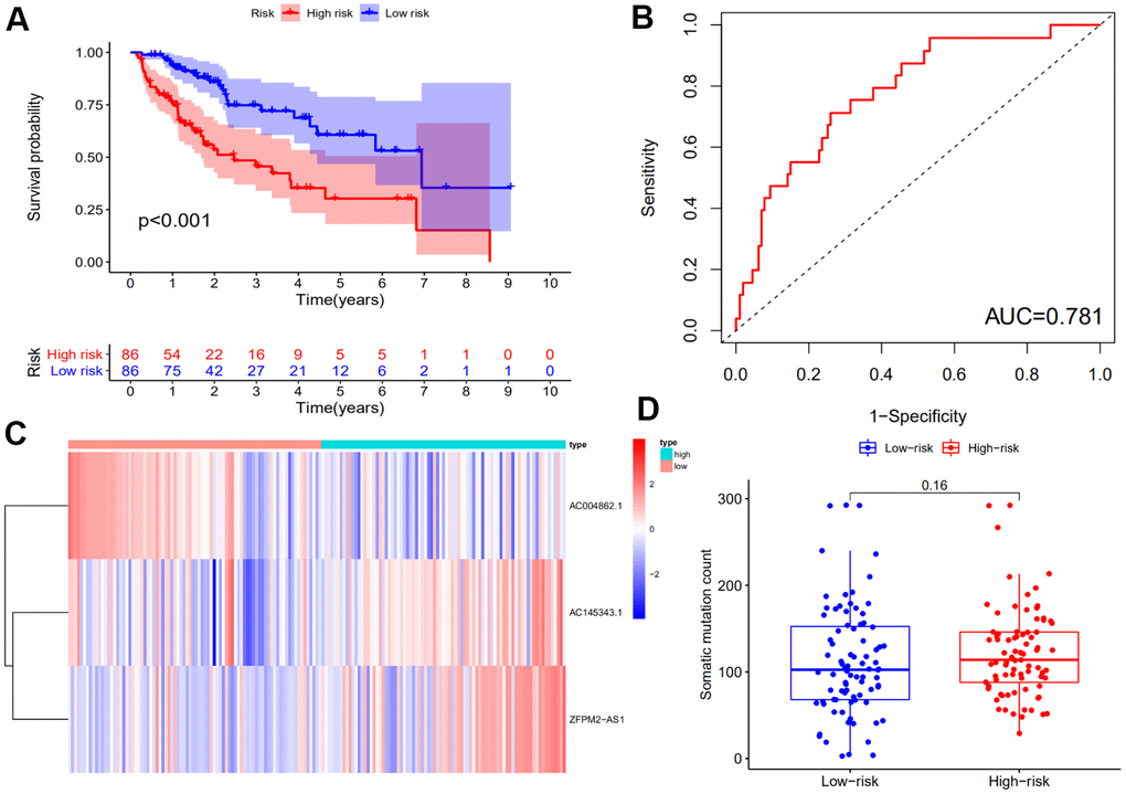 Group (P<0.001, log rank test; Figure 2A). The time-dependent ROC curve was illustrated in Figure 2B and demonstrated an AUC of 0.781 for the GILncSig. We also plotted the expression levels of lncRNAs in the GILncSig and the count of somatic mutations with the increasing score in patients of the training set. As shown in Figure 2C, the risk lncRNA AC145343.1 and ZFPM2-AS1 showed up-regulated expression while the protective lncRNA AC004862.1 showed opposing expression pattern in the samples with high risk scores. Comparison analysis showed the number of somatic mutation between two groups has no significance (P = 0.16) but the average count of somatic mutation in patients of high-risk group was higher than that of low-risk group (Figure 2D).