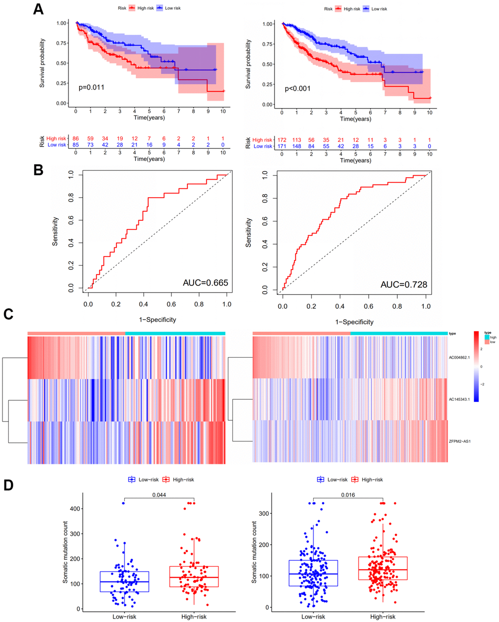 The RNA-seq data of testing group including 171 HCC samples was analyzed to assess the stability, validity and prediction ability of the GILncSig. Patients in the testing group were also evenly separated into the high-risk group and low-risk group based on their GILncSig score. Kaplan–Meier survival analysis showed that patients in the high-risk group had a shorter survival time compared to those in the low-risk group (P<0.05) (Figure 3A; Left panel). The time-dependent ROC curves analysis of the GILncSig in the testing set yielded an AUC of 0.665 (Figure 3B; Left panel). Then we sorted the samples in the testing group according to GILncSig score with the increasing order to further demonstrate the alteration of the expression levels of the GILncSig (Figure 3C; Left panel). Concurring with the expectation, the risk lncRNAs AC145343.1 and ZFPM2-AS1 were more highly expressed and the protective lncRNA AC004862.1 showed lower expression pattern in the patients of testing set with higher risk scores. The number of the distribution of somatic mutation in patients with high scores was significantly higher than in patients with low scores (P<0.05, Figure 3D; Left panel).