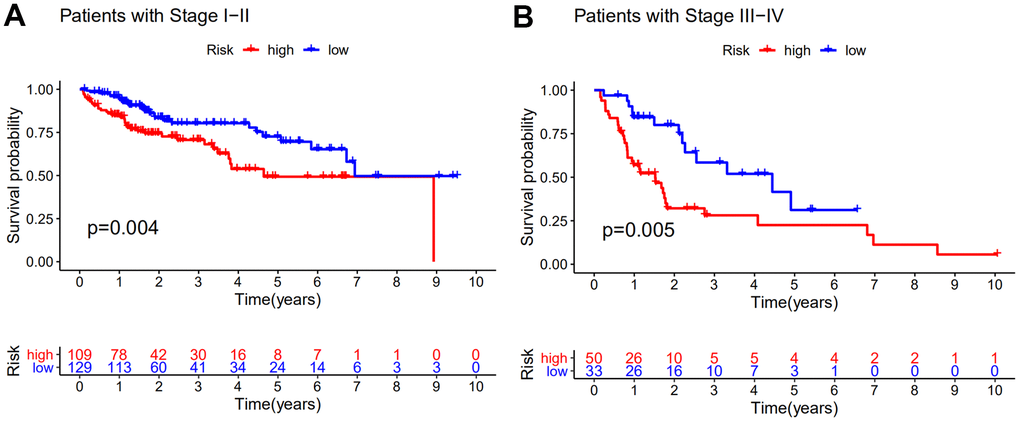 To access the prognostic value of other clinical factors, we first conducted univariate Cox regression analyses on age, gender, tumor grade, tumor stage and GILncSig of each set. The result showed that only tumor stage and GILncSig were closely related to the survival time of HCC patients in each set (Table 2). Multivariate Cox regression was further analyzed to explore the independence performance of the GILncSig. Tumor stage and GILncSig also exhibited significant difference in each group based on the multivariate analysis result (Table 2). Then we continued to examine whether the prognosis performance of GILncSig was independent of the tumor stage. We excluded the patients with unknown stage and stratified remaining samples into early-stage group (stage I-II, n = 238) and late-stage group (stage III-IV, n = 83) for stratification analysis. Samples in each group were further separated into high- risk and low-risk group. A significant difference in survival outcome between high-risk and low-risk group was observed in both early-stage group and a late-stage group (P<0.01) (Figure 4). It was clear that the GILncSig could serve as an independent prognostic factor for the overall survival of HCC patients.