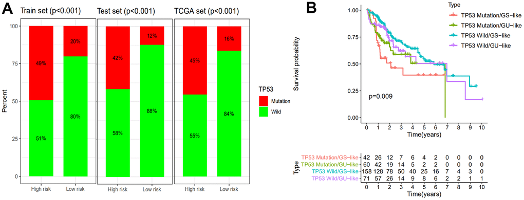 It is reported that mutation of TP53 gene is associated with worse survival in cancer patients [30]. Statistic results suggested that patients in the high-risk group have a significantly higher percentage of TP53 mutations than patients in the low-risk group among the training set, testing set and all TCGA samples (Figure 6A) (P<0.001). The proportions of TP53 mutation in the high-risk group of the training set, testing set and TCGA set were 49%, 42% and 45% respectively. In the low-risk group of the training set, testing set and TCGA set, TP53 mutation proportions were 20%, 12% and 16% respectively. TP53 transcriptionally targets hundreds of genes and regulates the expression of gene contributed to cell cycle, apoptosis, DNA repair proteins and metabolic [31, 32]. Recent studies had demonstrated that mutation of TP53 increased genomic instability and served as an independent prognostic marker [33–37]. Therefore, we continued to compare the performance of the GILncSig and TP53 mutation status in prognosis value. According to the GILncSig and TP53 mutation status, we classified all samples into TP53 Mutation/GS−like group, TP53 Mutation/GU−like group, TP53 Wild/GS−like group and TP53 Wild/GU−like group. Figure 6B revealed the survival curve of four risk groups. With regard to GU−like patients, the survival of TP53 Mutation group was more closely resembles that of TP53 Wild group. However, for patients with TP53 mutation, the survival of GU−like group was not similar to the GS−like group. Moreover, the survival outcome of patients in both GU−like group and TP53 mutation group were significantly worse than that in both GS−like group and TP53 wild group, indicating that the GILncSig and TP53 mutation status exhibited better prognostic performance than TP53 mutation status alone.